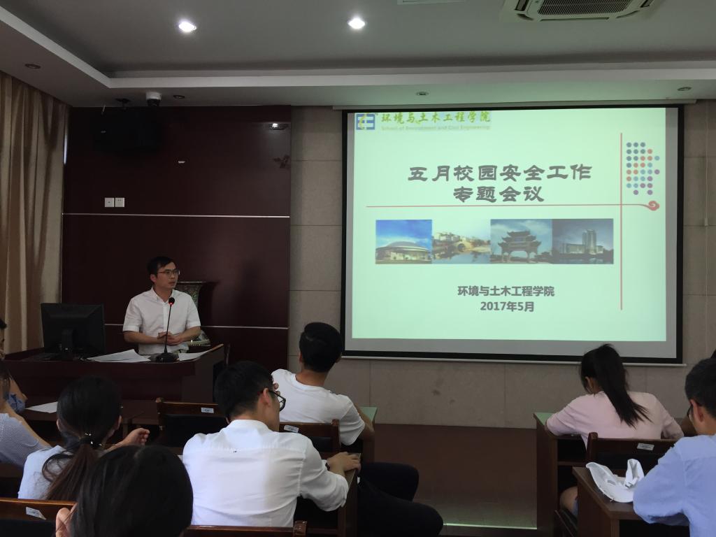 为了营造更加健康积极的校园生活环境维护校园安全稳定,2017年5月10日星期三中午,环土学院在D303召开了校园安全工作专题会议。本次会议主要面向包括研究生在内的全院各班学生主要干部,各专业辅导员参加了本次会议分,会议由分团委书记蒋达锋老师主持。