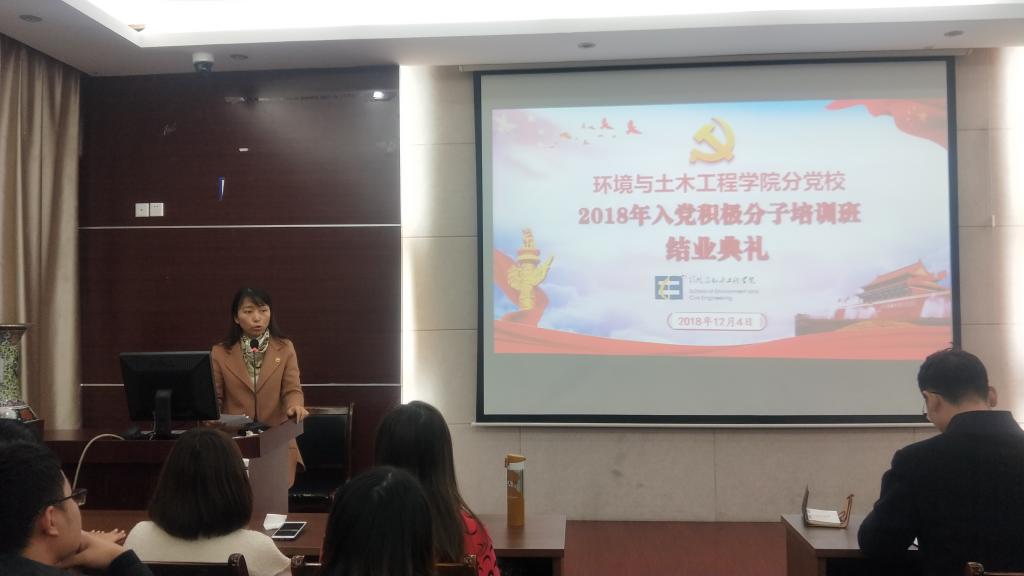 12月4日中午,环境与土木工程学院分党校2018年入党积极分子培训班结业典礼在D303会议室顺利举行。院党委副书记、分党校副校长金明媚,院党委秘书沈炎,本科生土木专业党支部书记薛羚伟以及全体学员出席典礼。典礼由培训班班主任何涛主持。