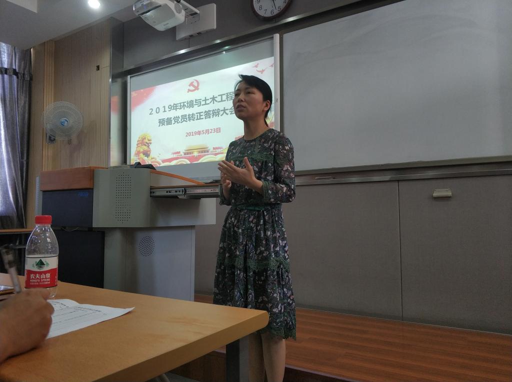 5月23日上午,环境与土木工程学院2019年上半年学生预备党员转正答辩大会在一教楼1B306教室举行。院副党委书记兼副院长金明媚,党委秘书沈炎,学工办主任兼团委书记蒋达锋,辅导员周佳赟、何涛担任评委,符合基本条件的预备党员参加答辩。本科生环工工管专业党支部组织委员王美娇主持会议。