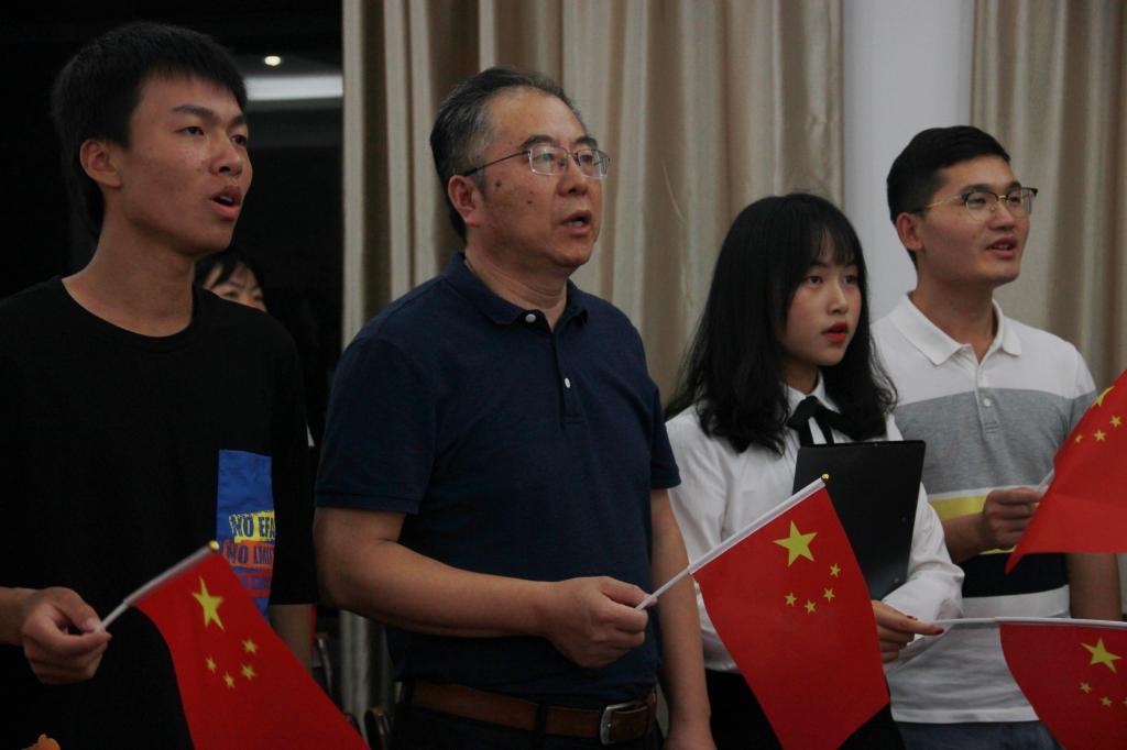 活动最后,全体师生挥舞手中的国旗,齐声合唱《我和我的祖国》,为新中国70周年华诞献上自己真诚的祝福。本期“杏坛听语”在激昂的合唱声中圆满结束。