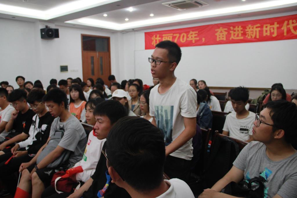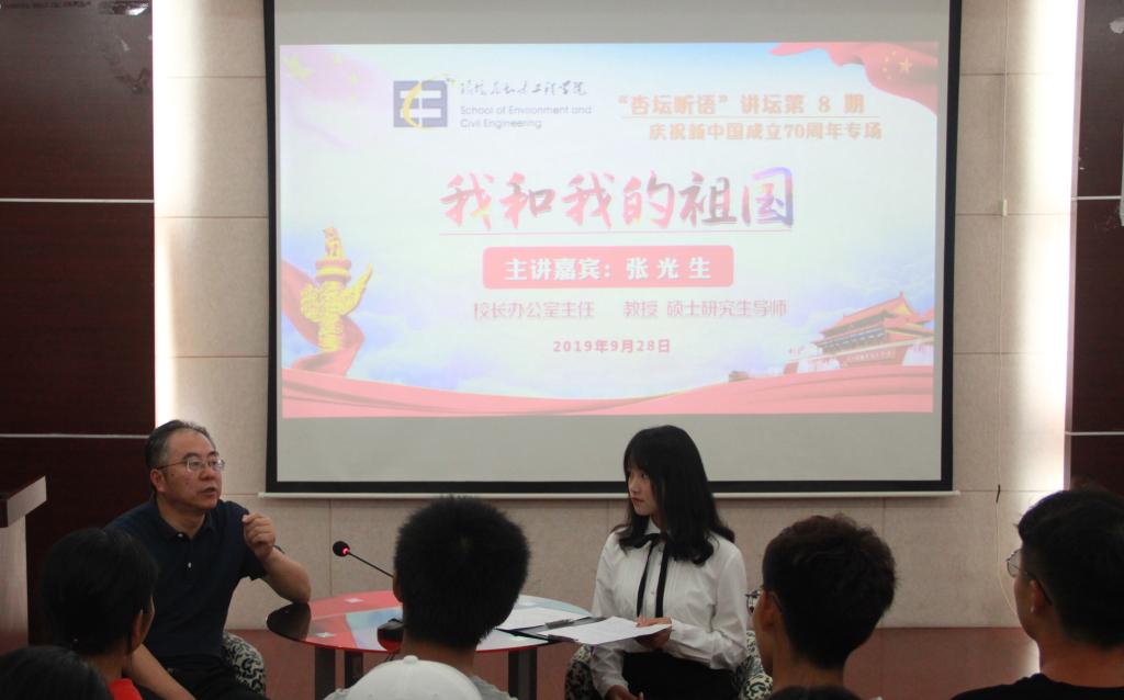 七十载不忘初心,新时代砥砺奋进。为庆祝新中国成立70周年,帮助新生解疑释惑,9月28日晚,环境与土木工程学院在D303会议室举办“杏坛听语”访谈活动。本期以“我和我的祖国”为主题,校长办公室主任张光生教授为我院学生分享交流奋斗故事,共抒爱国情怀,共话祖国新貌。活动由张磊、占绮红同学主持,辅导员何涛和2019级环境工程专业全体新生参与。