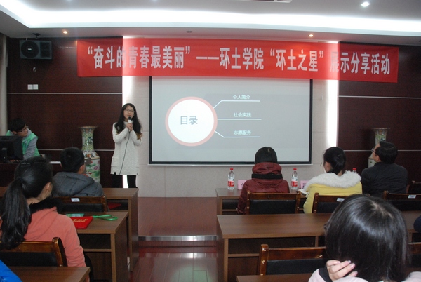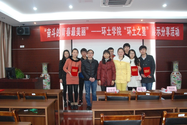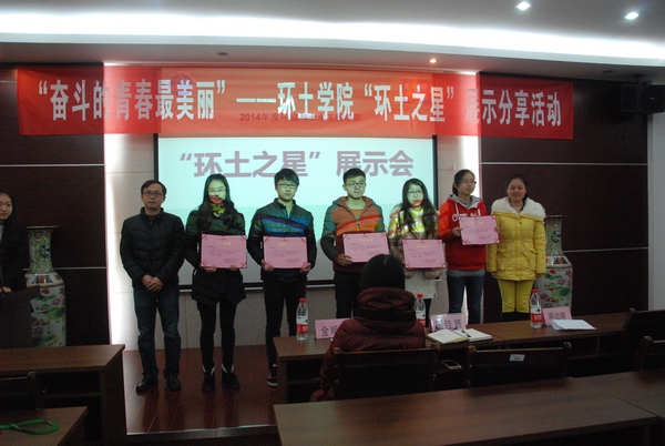 活动伊始,进行了环土学院2014年度“环土之星”颁奖仪式,由蒋达峰老师宣布获奖名单,金明媚老师进行颁奖。“环土之星”是为了表彰环土学院在大学学习生活中坚持奋斗,努力刻苦,具有杰出表现的同学,他们是未来新生的榜样和青春的引领者。