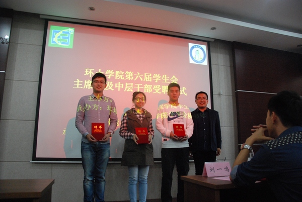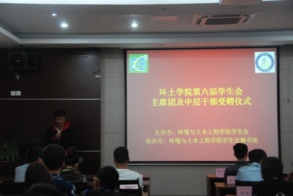 2014年10月24日下午四点,于环境与土木工程学院楼3楼会议室召开了由环土学生会秘书处主办的环境与土木工程学院学生会第六届主席团及中层干部受聘仪式,出席本次仪式的嘉宾有分团委副书记张铁根老师、第六届主席团代表李浩、刘一鸣、吴天宝三位同学以及应届环土学生会各中心主任副主任。