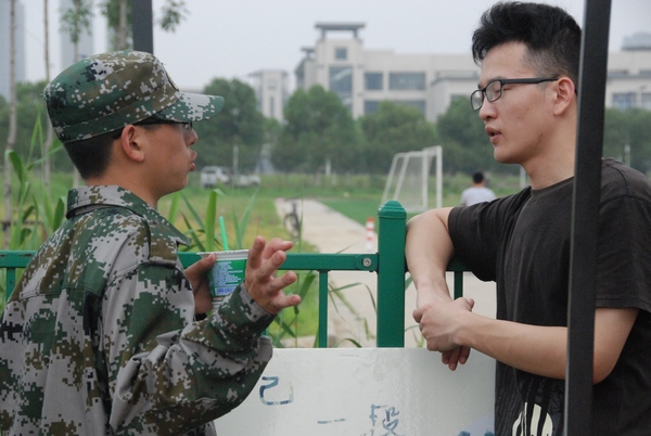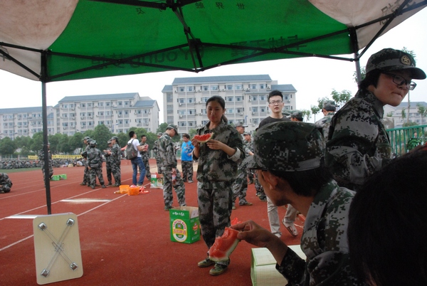 2014年6月22日,虽然又是一个阴天,但天气还是一样的闷热,步伐、口号与汗水依旧是环境与土木工程学院13级学生们在训练场上最耀眼的标志,每个方阵都在竭尽全力做到最好,整齐划一,气势不凡。而趁此气势高昂之际,每个班的副班来到了军训场上慰问操练着的13级学生。
