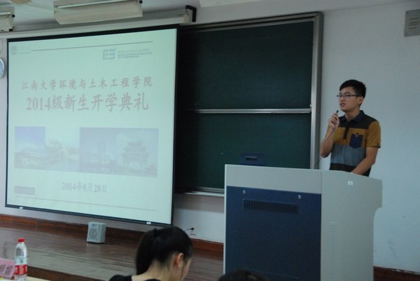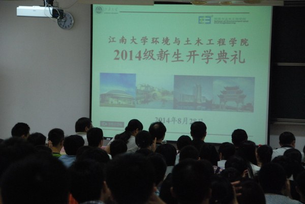 2014年8月30日上午,环境与土木工程学院2014级新生开学典礼在2D308教室举行。环土学院院长阮文权教授、党委书记华渊教授、副院长王中华副教授、李秀芬教授、党委副书记金明媚老师、系主任冯小平教授、李志华副教授、任红艳副教授以及辅导员老师和14级新生一同参加了本次开学典礼。会议由金明媚老师主持。