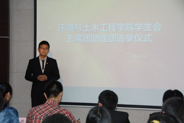 2014年5月9日星期五晚八点,环境与土木工程学院学生会主席团助理团选举仪式于学院楼多媒体教室举行。本次面试的评委分别是环土学生会主席李浩、常务副主席成丽娟、副主席兼社联主席吴天宝以及副主席秦凯、刘一鸣。