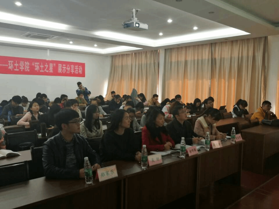 在一片掌声中主持人张杰首先介绍了此次评选的规则及评分细则。“环土之星“评选分为学习学术类、实践服务类、科技创新类、自立自强类、班团活动类、文体艺术类共六大类别。随后,候选人们开始了自己的展示。一张张精美的幻灯片、一幅幅动人的图片在荧幕上跳跃。各位候选人各展所长,将自己在校期间参与的活动与获得的经验与在座同学一一分享,满座新生无不被学长学姐们的优异事迹激励,热烈的掌声也一直回荡在教室之中。