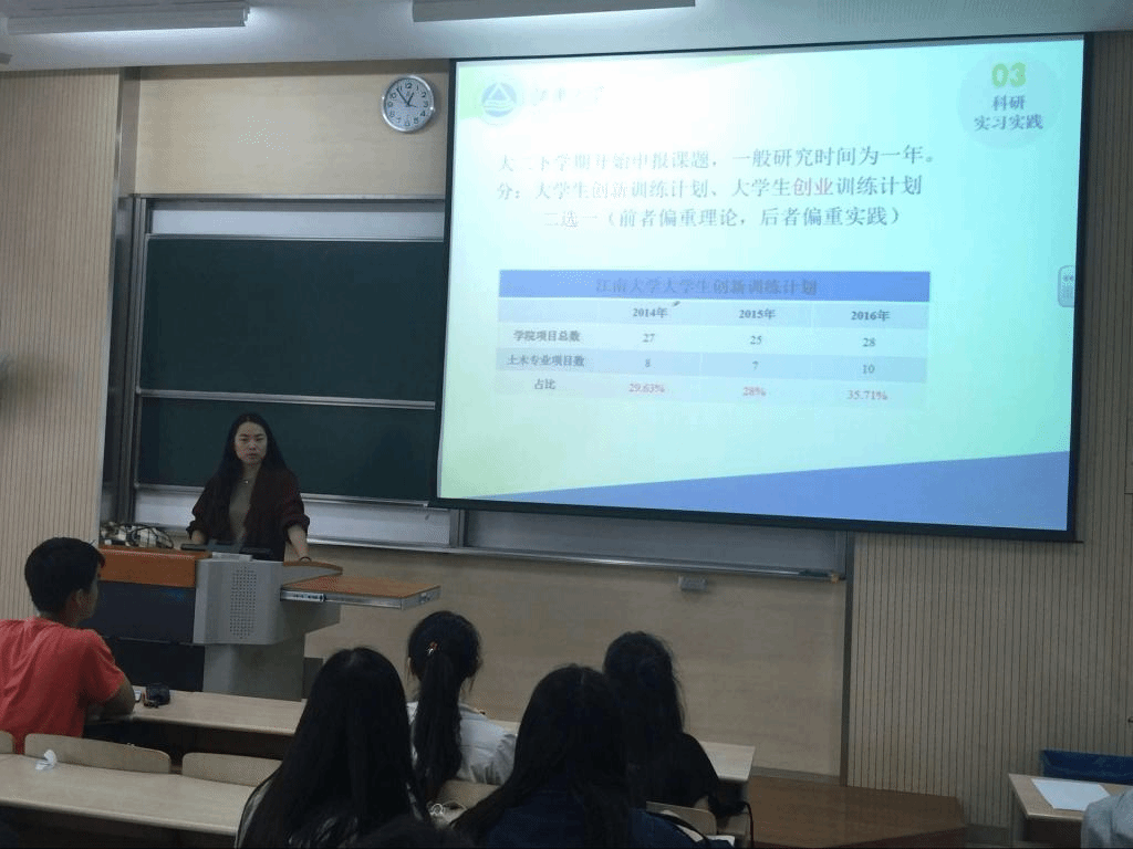 三、科研实习实践:老师为同学们介绍了科研、实习实践事宜。包括:第一,社会实践。要求同学们积极参加,将专业与社会实践紧密结合,学以致用。第二,认识实习、科研培训和生产实习。建议实习内容与专业相关,促进大家对专业的学习理解。第三,提出了第二课堂成绩单的要求。大学阶段在学习知识的同时要注重能力的培养与提高。老师还简单介绍了大学生创新训练计划与大学生创业计划,希望大家为之后的申报做好准备。