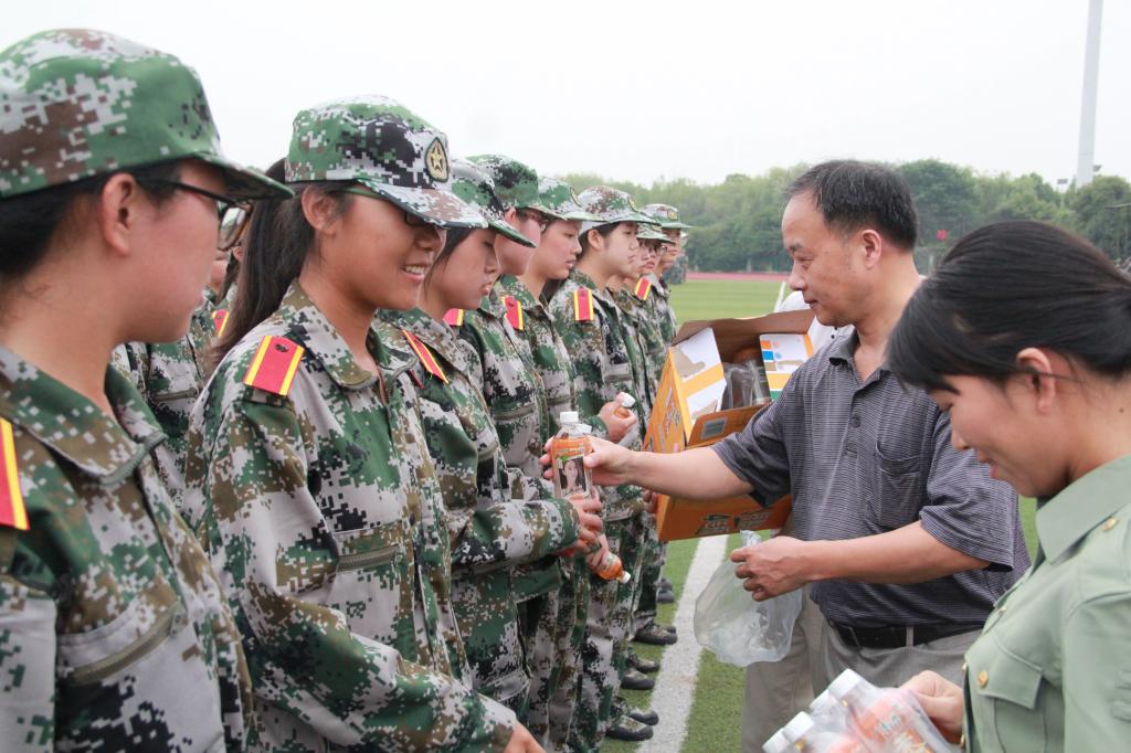 讲话结束后,华渊书记与金明媚老师亲自为军训教官与参训学生们分发饮料。同学们感受到了院领导亲切的关怀与照顾,纷纷表示将以更加激昂的姿态面对接下来的训练。为了回报学院领导的慰问,我院参加军歌比赛的同学们出列为同学与老师唱校歌,歌声婉转动听,收获阵阵掌声。紧接着辅导员蒋达锋也在同学们盛情邀请之下唱了一首军歌。