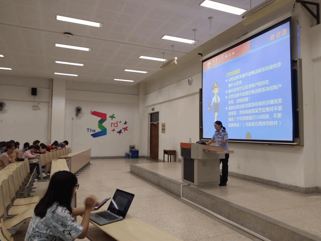 随后,滨湖分局雪浪派出所的邓钱萍警官,根据江苏省公安厅统计的安全隐患数据,围绕盗窃、诈骗及火灾问题展开了安全教育。她向同学们讲述了数起大学生被骗的真实案例:如跑步时将包放在一旁、在餐厅利用背包占座导致财产损失……而诈骗方式主要有网购刷单诈骗、兼职诈骗、校园贷款和谎称亲友等。她叮嘱同学们,盗窃常发生在同学们放松警惕的瞬间,如何保管好自己的随身物品,是每一个大学生的必修课。随后,邓警官再次强调了个人信息及诚信的重要性,希望大家避免信息泄露,珍惜自己的个人信誉,不要轻易在网上贷款。讲座的最后,邓警官给大家播放了消防安全视频,让大家学习了一些火场逃生的技巧,呼吁大家提高防火意识。
