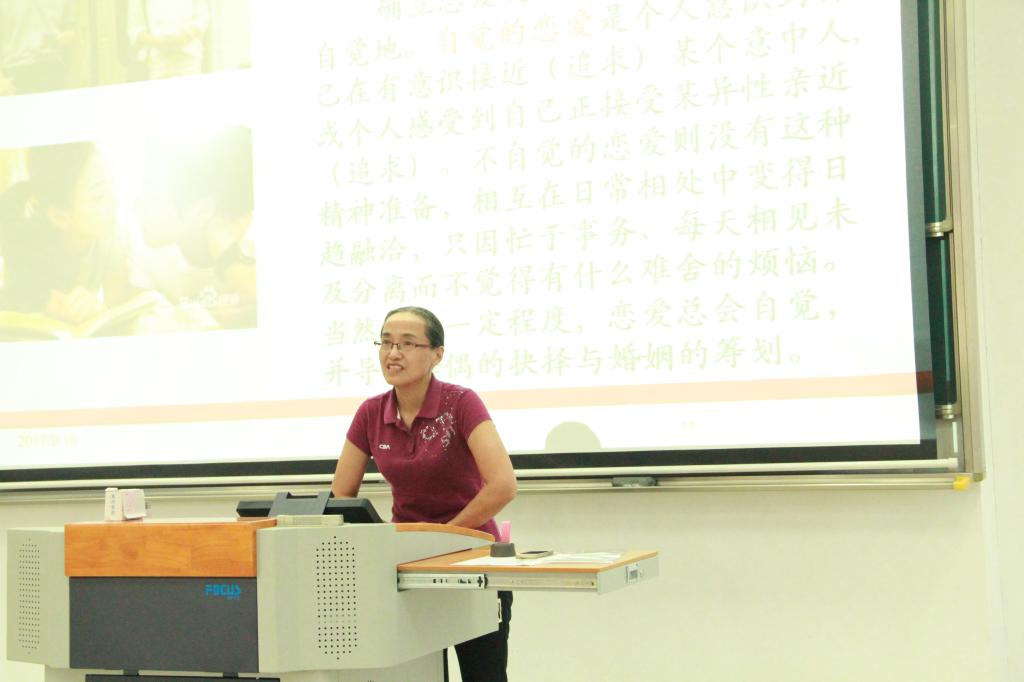 讲座伊始,沈老师就和同学们进行了互动:让同学们谈谈室友们的恋爱观。在大家的讨论中,现场的氛围慢慢地被调动起来。随后,沈老师进入了讲座的主题。她从高生的恋爱观讲起,明确指出了大学恋爱观和高中的不同:大学的恋爱少了家长和老师的干涉,显得更加普遍和自由。但由此她又强调,虽然大学生恋爱的可能性增加了,但务必要树立正确、积极向上的恋爱观,不要过于痴迷于谈恋爱,应该把它当做一门选修课,而不是必修课。