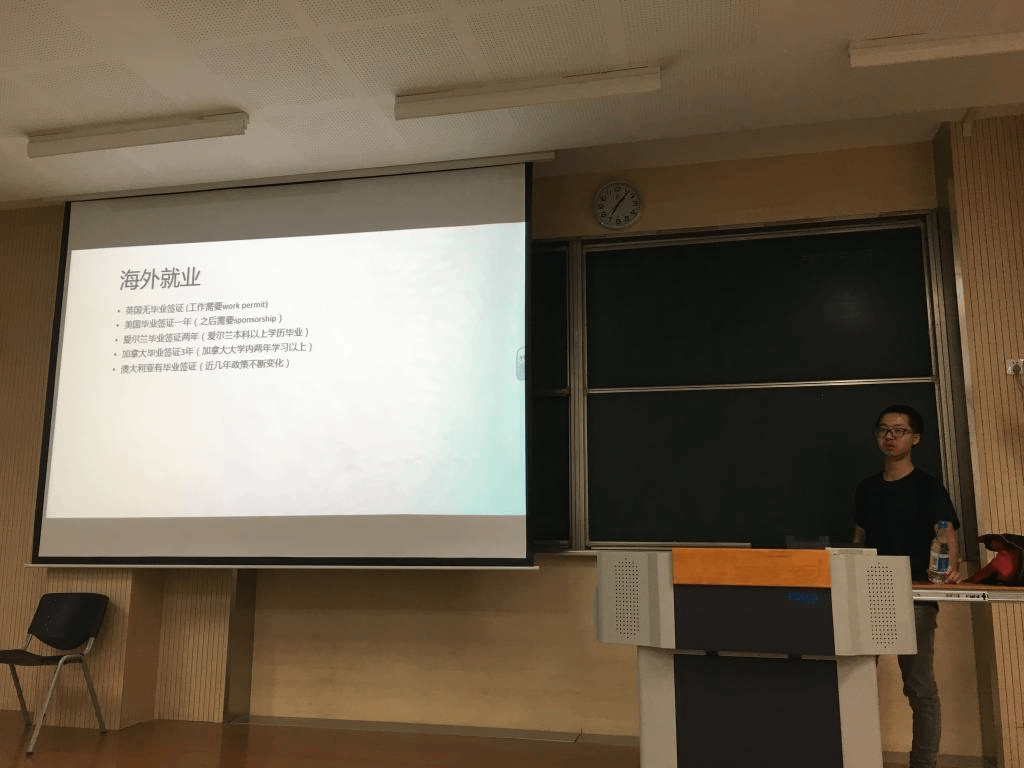 讲座围绕着海外学校选择和深造、就业两个方面展开。首先,潘枭同学对比了国外几所知名大学的情况,向同学们介绍选择进修高校所需考虑的主要问题,并重点介绍了如何申请及攻读国外的研究生,向同学们介绍了如何通过申请包括中国留学基金委奖学金在内的资助来降低留学经费的方法;随后,潘枭同学与同学们探讨了留学后海外就业会面临的问题,并就同学们关心的签证以及其他资格证的问题进行了解答。最后,潘枭同学还介绍了海外移民定居的相关政策。