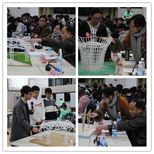 首先,专业组一一进行了150秒的模型展示,随后,参赛选手就本组模型的构造设计进行答辩。评委老师们指出,由于参赛选手大多来自低年级,对模型的结构原理及受力过程理解并不透彻,但他们的创意和想法值得肯定,模型的设计和创作中也有不少亮点。每三组展示后,评委进行打分。期间,主持人与观众进行了热情的互动,点评和抽奖环节将现场气氛推向了高潮。紧接着,最佳人气奖的微信投票评选也同步开启。随后,8个兴趣组依次进行了120秒的模型PPT展示,现场不设评分环节,选手们向大家分享了建模过程中的灵感和设计理念。抛开了受力等问题的束缚,造型奇特、别具匠心的模型给人们一场视觉盛宴。