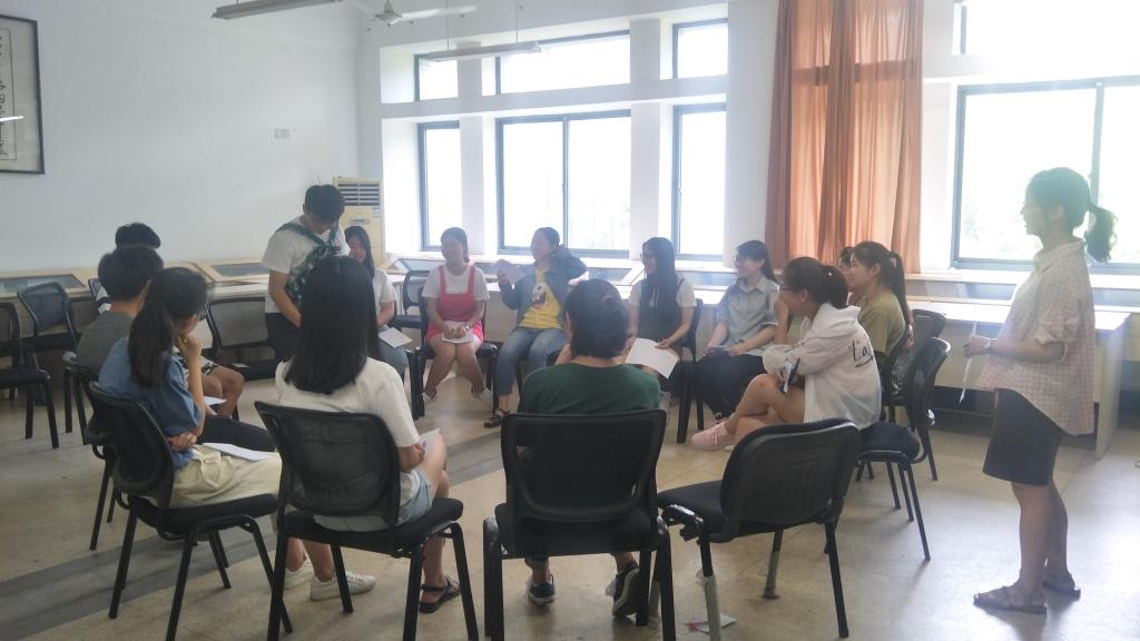 活动伊始,庄老师带领同学们一起做三个破冰小游戏。“123做动作”游戏、抱团游戏和“解手链”游戏,既让大家活跃了大脑,又活动了身体,同学们很快投入本次心理团辅活动之中,现场气氛立刻热烈起来。接着的自画像小游戏中,同学们对自己和其他参与人员都有了进一步的认识。之后,庄老师由浅入深的提问了有关妈妈的问题,让学生们意识到了自己对妈妈的了解程度并不像自己所想的深,引起了同学们的反思。然后,同学们通过前背书包捡笔体验了一次怀孕的经历,生动形象地让学同学们体会到女性怀胎十月的不易。最后的团队无交流画画中,每个小组的成员手绘图画,成员之间互相思考其他成员画作的意义。同学们想法新颖,现场不时响起阵阵笑声。最后,小组成员合作来完成一幅画作,让学生们在绘画的过程中不但获得了乐趣也感受到了团队凝聚力的重要性。
