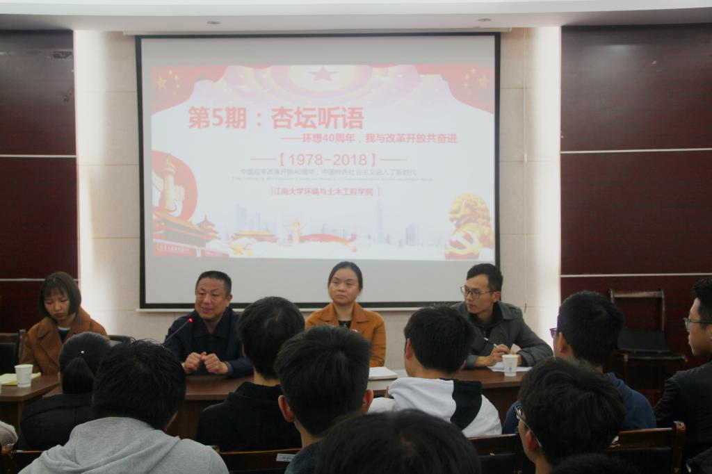 姜晨光慷慨激昂地讲述了自新中国成立以来的那段历史,从新中国成立到改革开放后的新时代发展,一步步引导同学们去回忆那段艰苦奋斗的历程,希望现代青年人“铁肩担道义,学会真本领,做一个无愧于时代的青年人”。梁婵娟老师讲述了她求学工作的心路历程和改革带给自己的影响,从动漫《灌篮高手》作为切入点,告诫同学们大学里要有坚定而高远的目标、真心朋友的陪伴以及踏实而沉稳的心态。青年教师李吴刚根据自己的亲身经历分析了改革对人民生活的影响,从社会经济情况、科研成果和国家综合实力等方面进行了总结,并列举了许多改革开放以来人民生活中变化的点点滴滴,以“我们的目标是星辰和大海”作结。沈玉芳讲述了自己对改革开放的见解,认为改革开放后人们生活水平在逐步提升,社会呈现出产品多样化、娱乐多元化以及生活便利化的样貌,最后以“山以险峻成其巍峨,海以奔涌成其壮阔”做总结。
