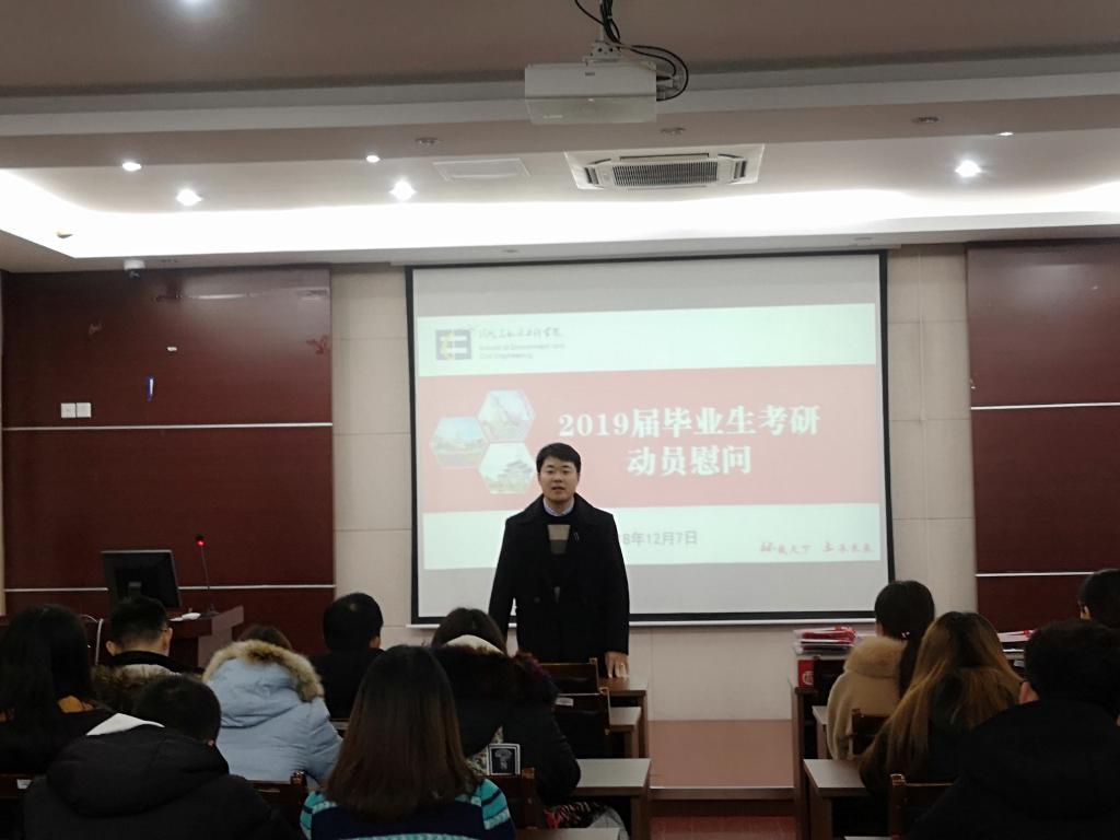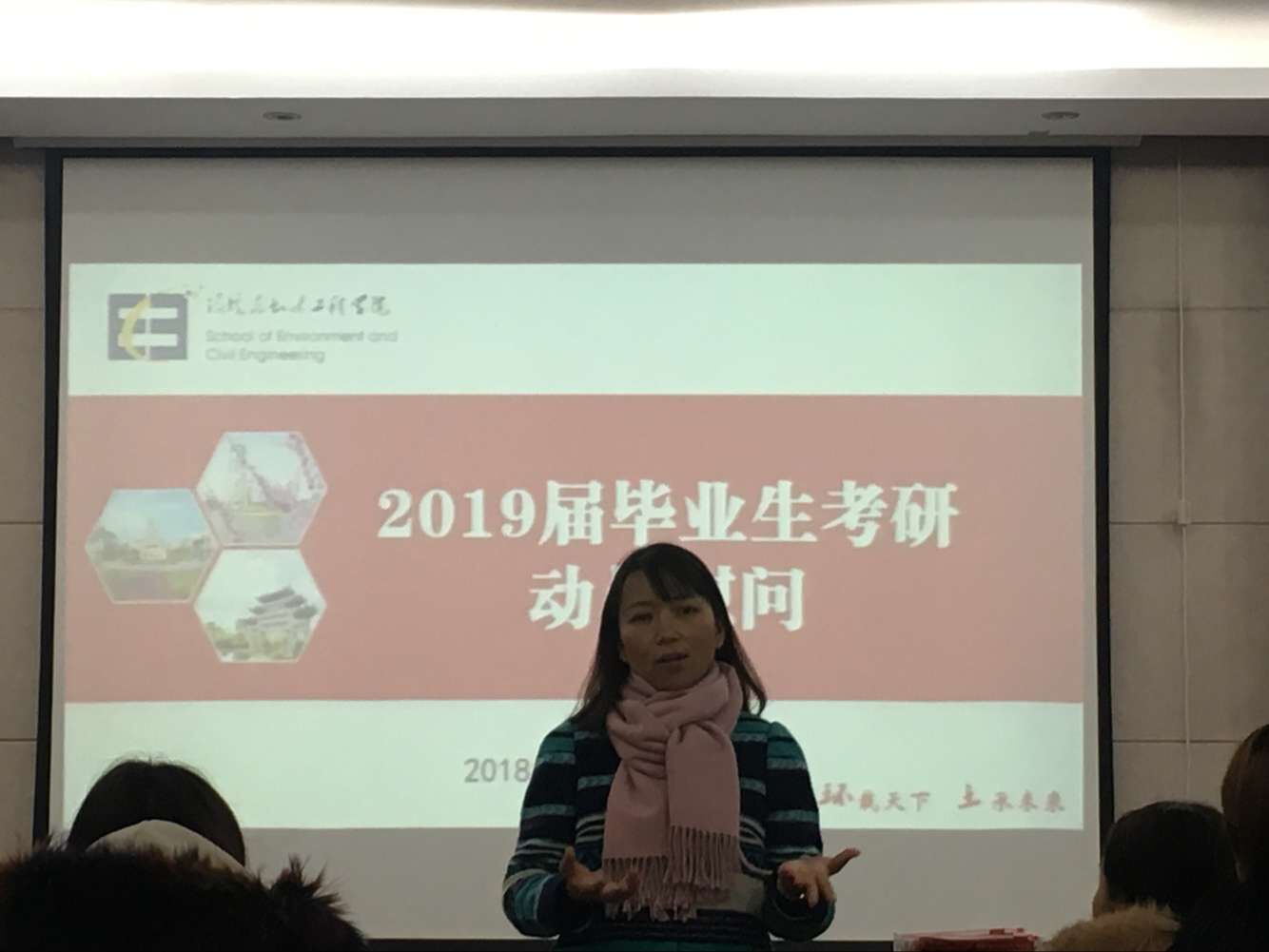 12月7日中午,环境与土木工程学院“考研送温暖“活动在学院楼D303顺利召开。院党委副书记、副院长金明媚,分团委书记兼学工办主任蒋达锋,辅导员薛羚伟以及2015级报考研究生考试的毕业生参加了活动,辅导员何涛主持活动。