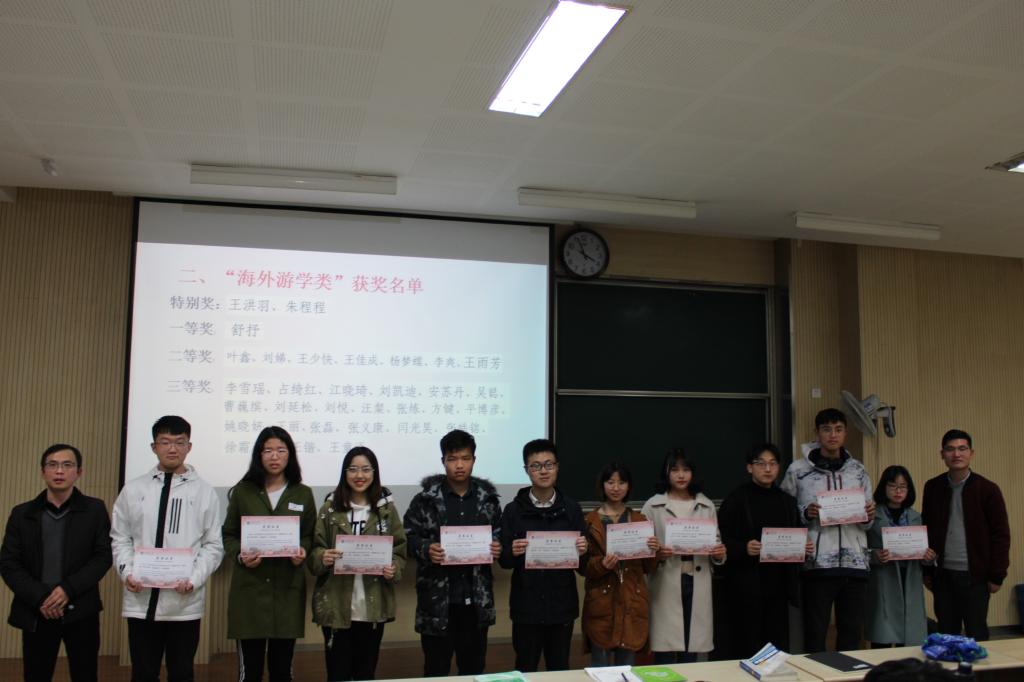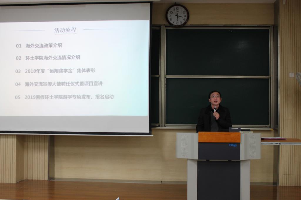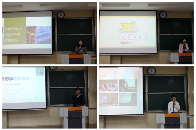 活动中举行了2019年海外交流宣传大使聘任仪式,2018年暑假加拿大Mitacs本科生实习合作奖学金(留学)项目的朱梦觉,2018年寒假环境与土木工程学院新加坡南洋理工访学项目的陈雨秋,2018年环境与土木工程学院日本京都大学访学项目的戴金呈和2018年环境与土木工程学院香港理工大学项目的王洪羽共四名优秀学子担任环土学院的海外宣传大使,何涛向其颁发聘书。四名宣传大使先后就自己的项目进行了经验分享。