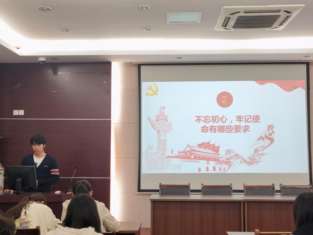 随后进行的是班级座谈会,以各班委分享、小组朗诵、PPT汇报展示等形式展开。组织委员王凯月在 “不忘初心、牢记使命”主题交流中讲到作为入党积极分子要坚定理想信念,努力学习习近平新时代中国特色社会主义思想。各小组在展示中大放异彩,朗诵时激情澎湃、慷慨激昂,交流时结合自身经历,谈新中国成立70周年的辉煌成就,坚定跟党走的信念。