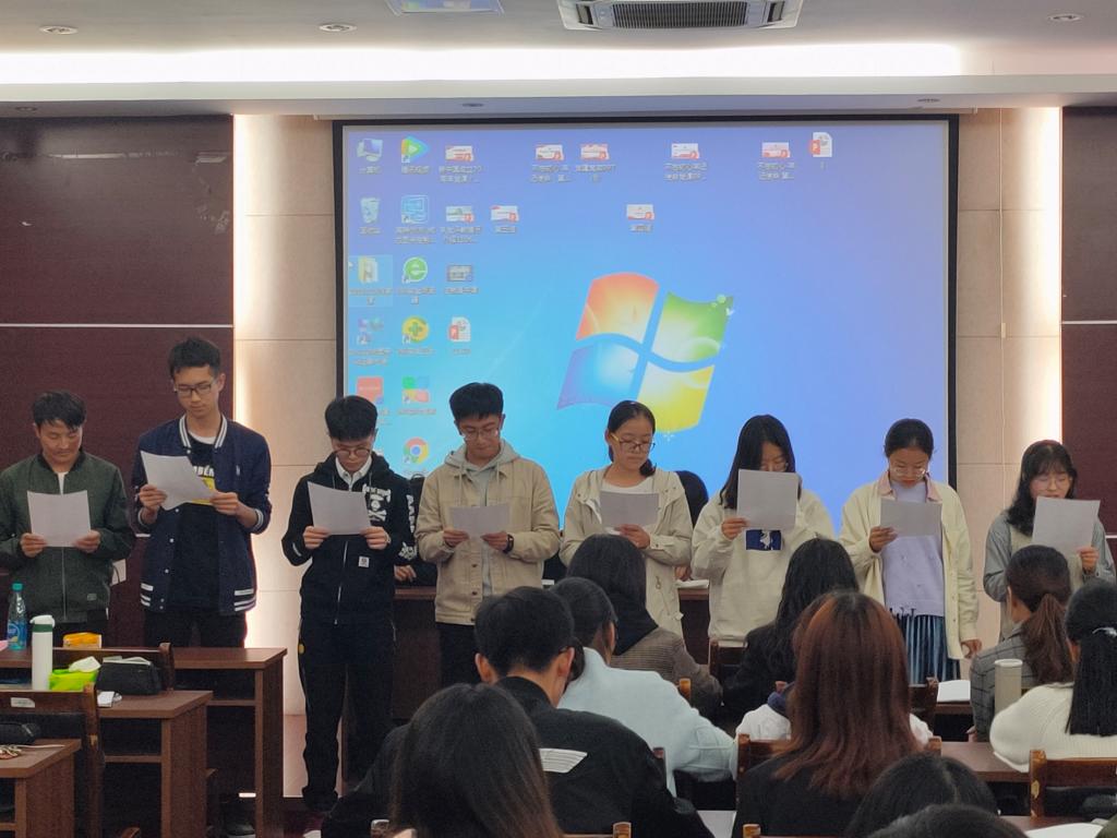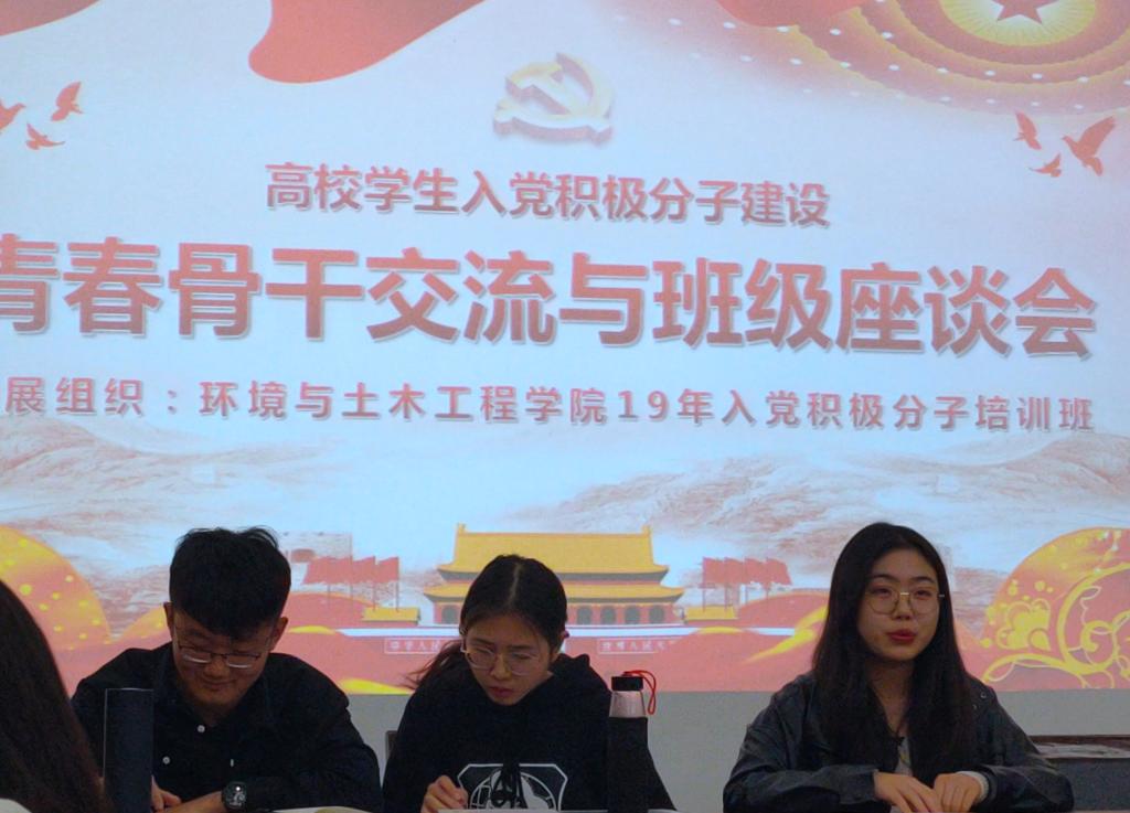 2019年11月10日,环境与土木工程学院分党校2019年学生入党积极分子第五次理论学习于学院楼D303会议室顺利进行,为促进培训班学员进一步制定目标、规划大学生活,本次课程学院邀请到2016级党员代表王洪羽、张慧旻、杜琬婷做“青春骨干”主题分享会。培训班班长陈洪主持讲座,全体学员参加。