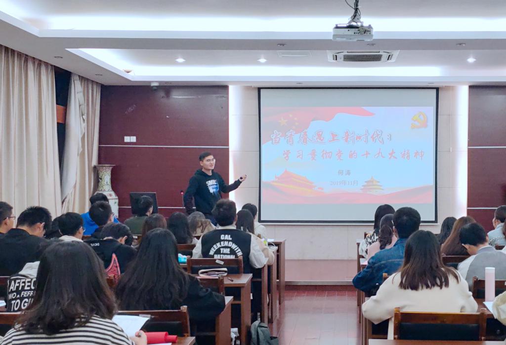 2019年11月15日,环境与土木工程学院分党校2019年学生入党积极分子培训班第六次理论学习如期开展。本次课程由培训班班主任,2018、2016级土木工程专业辅导员何涛主讲——当青春遇上新时代,全体学员参加。