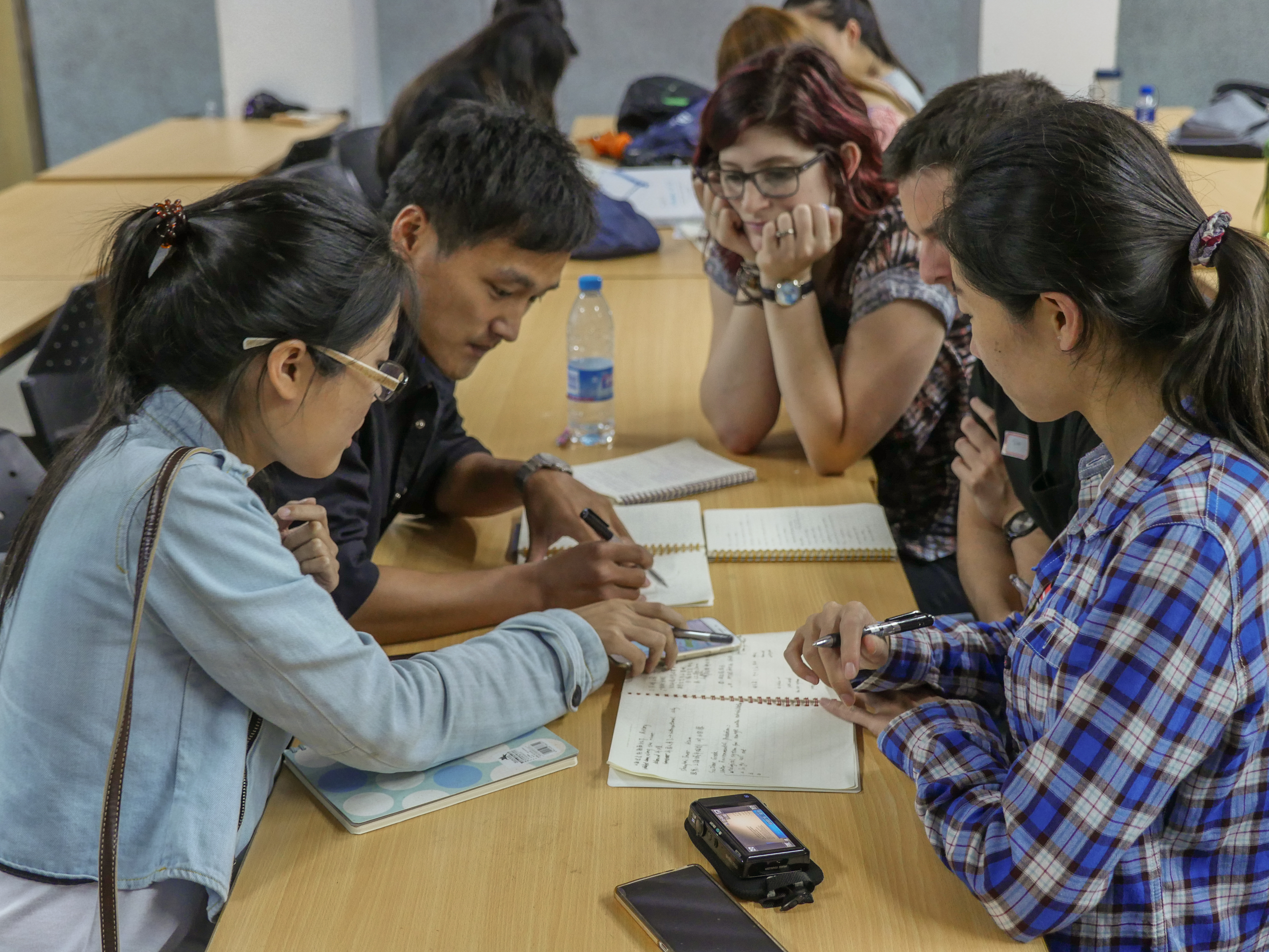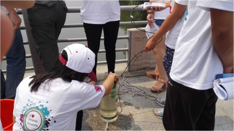 中外学生按小组做学习与讨论 学生在做水质调查与分析
