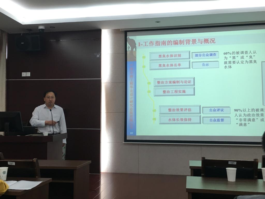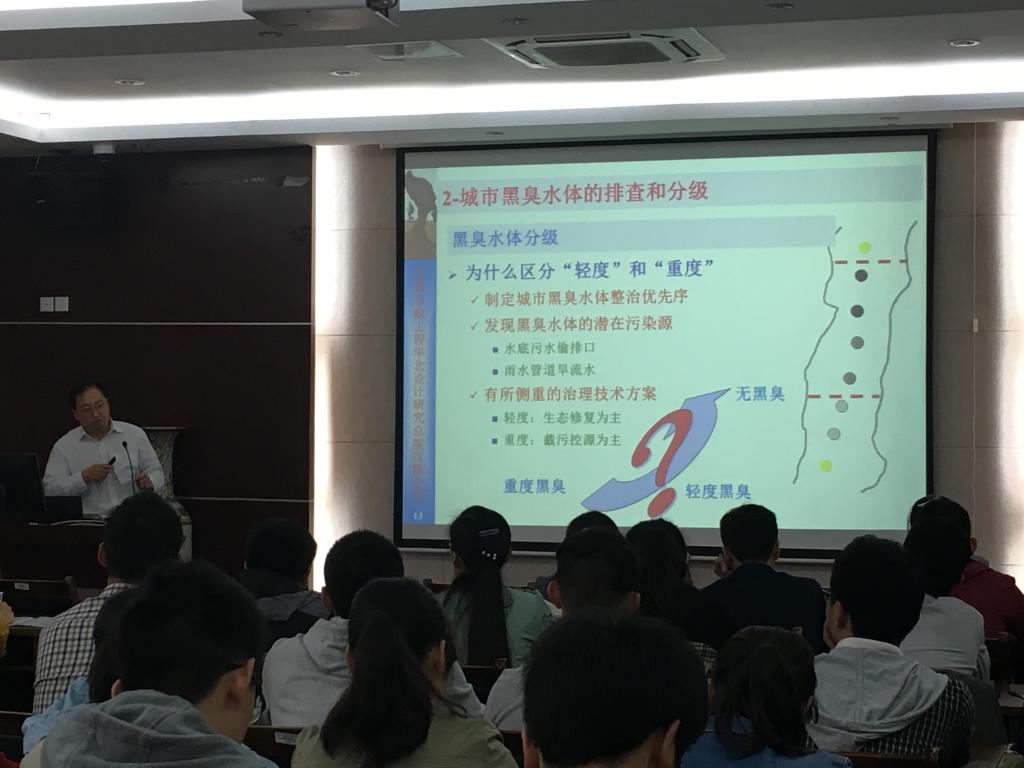 孙永利院长进行了题为“城市黑臭水体整治工作指南与技术要点——城市黑臭水体整治工作指南解读”的专题报告,介绍了《城市黑臭水体整治工作指南》的编撰背景,阐述了城市黑臭水体的排查分级方法、城市黑臭水体整治方案编制流程及黑臭水体的整治技术。孙永利院长介绍了城市黑臭水体的形成原因,分析了城市与工业发展对水体造成的危害,总结了目前我国城市黑臭水体整治所作出的努力与工作成果。着重分析了城市黑臭水体整治技术及存在的误区,报告指出城市黑臭水体的整治必须经过水变清、水流动、水自净三个过程。水变清主要包括截断外源、治理内源、水质净化等方面;水体流动主要包括水体循环、旁路治理、生态补水、断面设计等方面;水自净则是通过海绵城市建设、生态修复、冲氧复氧等手段实现。孙永利院长通过结合部分城市黑臭水体的整治实例,分析了各个整治技术的必要性、针对性及可能遇到的困难,同时提出相应的解决方案。孙永利院长专业的知识构架、敏锐的思维、严谨的态度得到了老师和同学们的一致赞扬,现场学术气氛极为活跃,学术交流会达到了预期效果,师生们都不同程度地拓宽了视野,尤其是对城市黑臭水体的整治技术及方案编制有了更加深刻的了解。