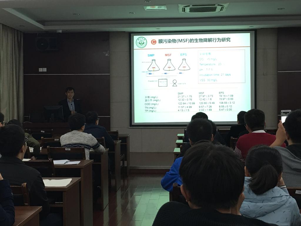 孟教授做了题为“膜生物反应器污水处理技术研究”的学术报告,介绍了膜污染的定性分析以及相关的原位膜污染控制措施,报告揭示了MBR运行中膜污染的关键影响因子、粘附机理以及相应的控制措施,为解决膜污染问题指明了方向。孟教授严谨的科研态度、以问题为导向的研究思路以及各种分析手段的灵活运用与组合给在座的老师和同学留下了深刻印象,师生们都不同程度地拓宽了视野,尤其是对膜污染的形成以及相关的控制方法有了更加深刻的了解。在学术交流环节中,现场学术气氛极为活跃,多位教师及硕士研究生针对目前比较热门的膜材料选取、EPS提取方法、平行因子分析三维荧光光谱图等问题以及如何发表高水平文章与孟凡刚教授进行了交流与探讨,拓宽了学院广大师生的研究思路,为今后发表高质量的文章指明了方向,学术交流达到了预期效果。