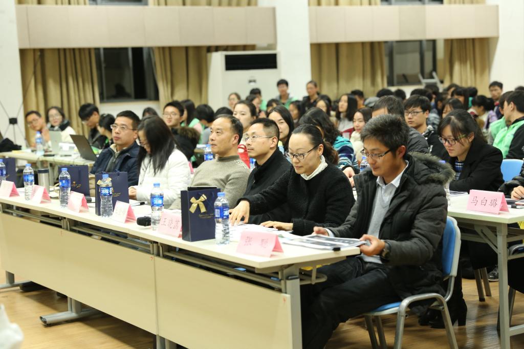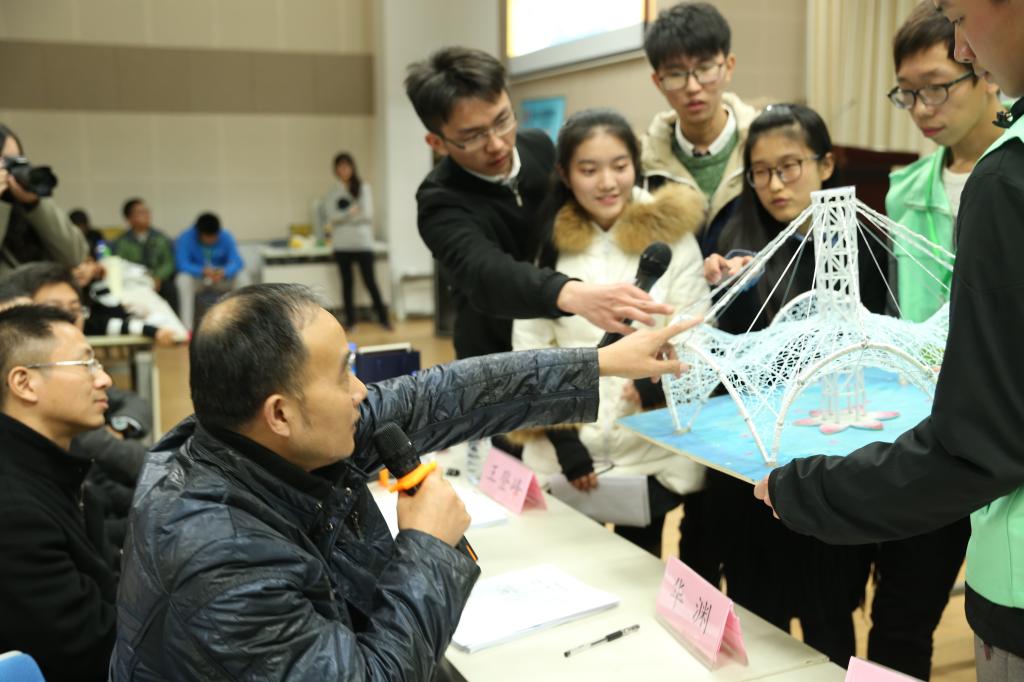 比赛伊始,华渊教授发表讲话,首先对我院学生代表在今年的江苏省大学生土木工程结构创新竞赛取得的优异成绩表示肯定和赞扬,随后,华书记指出了结构模型的五个基本原则,在对打分依据进行了说明之后,最后预祝此次建筑模型大赛成功举办。随后,各组模型依次上台展示。专业组的评比着重对于建筑结构的创新与应用,和在符合专业知识的前提下进行适当的创新。第一个专业组作品《鼋》即以其严谨的专业原理获得了现场观众和评委的好评,《冬季恋歌》、《云阙》因其精致的造型和精彩的展示表现给观众留下了深刻的印象。在评委提问答疑过程中,各个小组随机应变,将所学的专业知识和模型结构相结合,与评委进行现场的交流与请教。