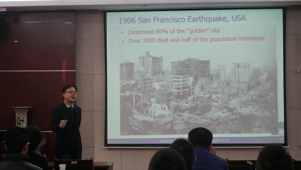在讲座中,Tony Yang教授首先介绍了地震对结构的危害并通过新西兰等地的实际案例阐述了结构抗震研究的重要性。之后教授介绍了结构抗震设计的先进理念和不同理念的应用条件;Opensees Navigator软件在模拟结构在地震作用下的性能的优越性;目前试验与软件模拟共同研究结构性能的趋势等。接着教授又着重介绍了等效能量设计方法的步骤及其优点。随后教授介绍了关于各种先进阻尼器研究的最新进展。最后到场的各位老师与教授积极讨论,互相学习,会场气氛良好。