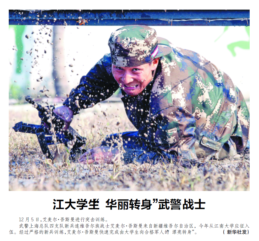 伟德国际1946bv环境与土木工程学院环境工程1402班学生艾麦尔.吾斯曼,2016年9月应征入伍。入伍以后各方面表现优异,相关事迹在无锡日报刊登。