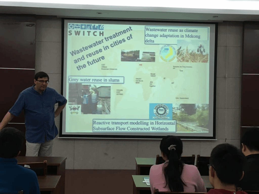 Prof. Piet Lens进行题为“应用循环经济理念的资源回收方法”的讲座,介绍了在有机质产沼气、营养元素循环利用和生物燃料等方面的高新技术。首先,教授介绍了餐厨垃圾与其他生产过程中产生的有机质利用厌氧膜生物反应器产生沼气的技术,同时分享了反应器的运行经验与实验结果。其次,介绍了营养元素在中从植物吸收到被人类或畜禽利用,最后废物回归自然的循环过程,并列举了营养元素回收利用的新技术,如屋顶植物、墙体植物与浮床植物等技术。此外,教授还详细介绍了污水金属利用硫元素价态变化回收金属单质的技术,可用硫元素回收的金属包括硒、铬、铜等。Prof. Piet Lens幽默的讲座方式、专业的知识构架、严谨的态度得到了老师和同学们的一致赞扬,现场学术氛围浓厚,达到了预期效果。师生们的知识层次与眼界均得到了较大的提升,尤其是在污水处理与资源回收利用方面得到了较大的突破。