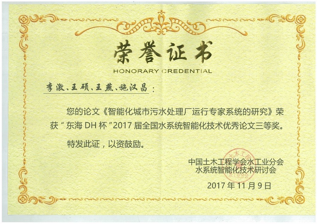 本次大会还开展了“东海DH杯”2017年全国水系统智能化技术优秀论文评选活动,我院李激教授的《智能化城市污水处理厂运行专家系统的研究》论文获得优秀论文三等奖。