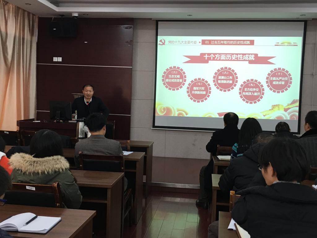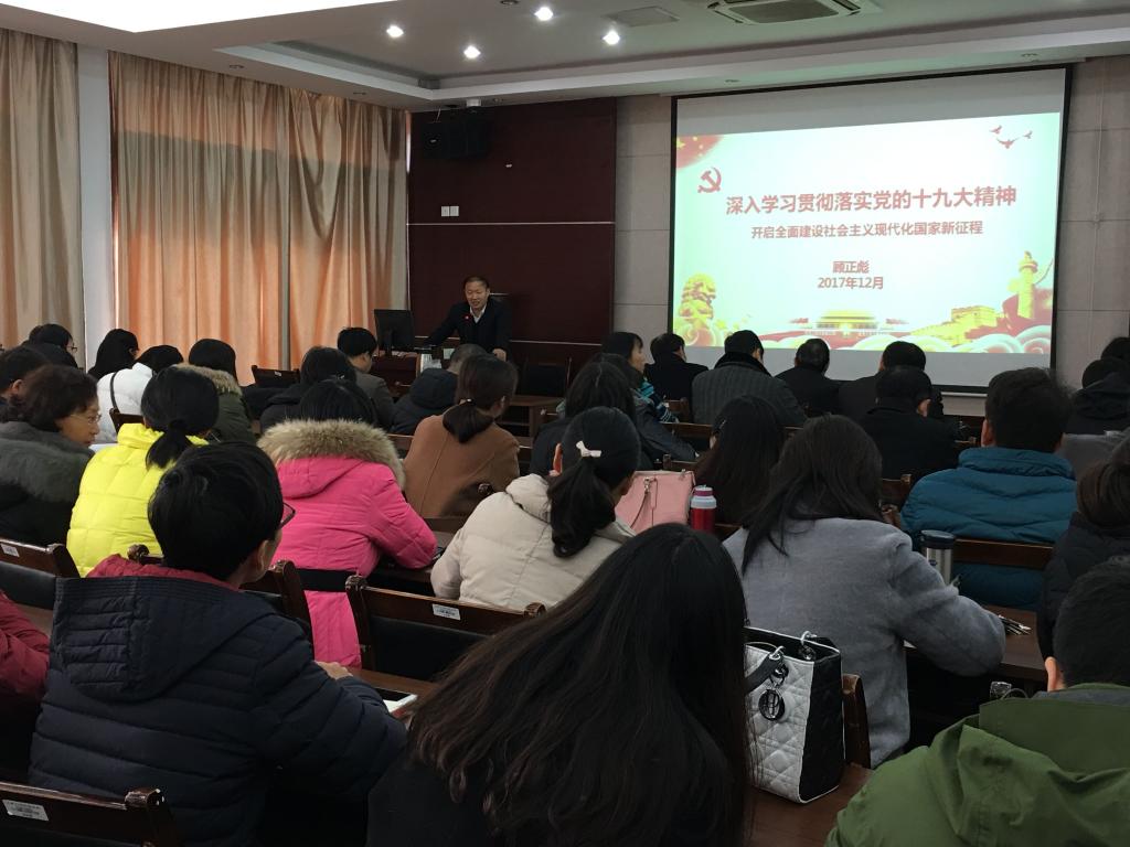 顾正彪同志分别从党的十九大的会议主题和主要成果,党的十九大报告主要内容,贯彻落实党的十九大精神、加快推动学校事业发展三个方面对党的十九大精神进行了全面系统的解读。他在宣讲中指出,党的十九大以“不忘初心、牢记使命,高举中国特色社会主义伟大旗帜,决胜全面建成小康社会,夺取新时代中国特色社会主义伟大胜利,为实现中华民族伟大复兴的中国梦不懈奋斗”为主题,系统介绍了过去五年来中国共产党带领全国人民在十个方面取得的历史性成就。过去的五年,是极不平凡的五年,五年来的成就是全方位的、开创性的,变革是深层次的、根本性的,解决了许多长期想解决而没有解决的难题,办成了许多过去想办而没有办成的大事。他强调,党的十九大是在全面建成小康社会的决胜期召开的一次重大会议,中国共产党人要不忘初心、牢记使命,与人民同呼吸、共命运、心连心,永远把人民对美好生活的向往作为奋斗目标,以永不懈怠的精神状态和一往无前的奋斗姿态,继续朝着实现中华民族伟大复兴的宏伟目标奋勇前行。