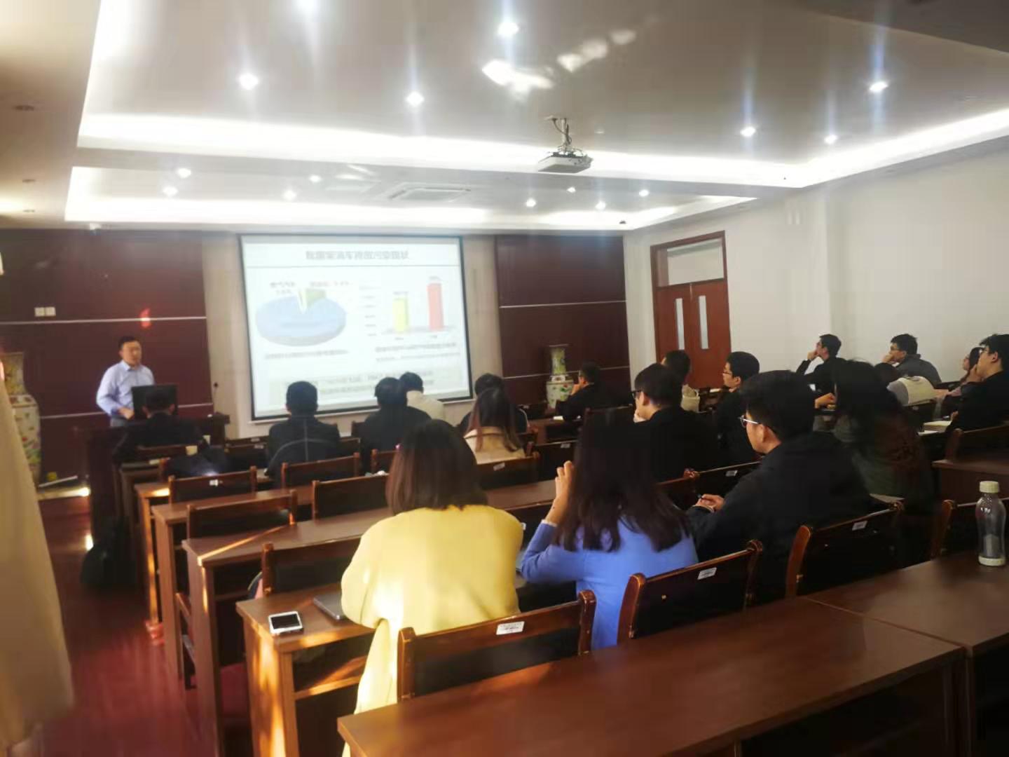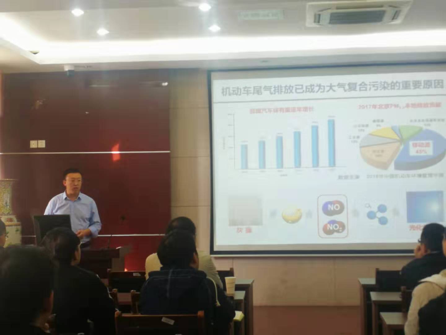 单文坡研究员首先介绍柴油车尾气排放NOx对我国大气污染现象的贡献,提出柴油车尾气NOx催化净化的重要性。然后介绍目前柴油车尾气NOx催化净化的主流技术-氨选择性催化还原技术(NH3-SCR),并系统介绍不同体系催化剂的优缺点,提出铜基小孔分子筛催化剂是未来可应对国VI排放标准的主推催化剂。最后,从示范应用的角度,提出为应对实际运行状态下的复杂工况,未来NH3-SCR催化剂还需在水热稳定性方面进一步提高性能。报告结束后,单文坡研究员与在场师生进行了热烈的学术讨论,并逐一回答了现场提问。