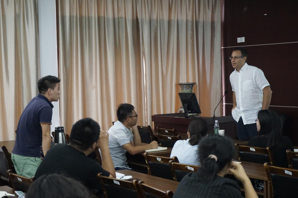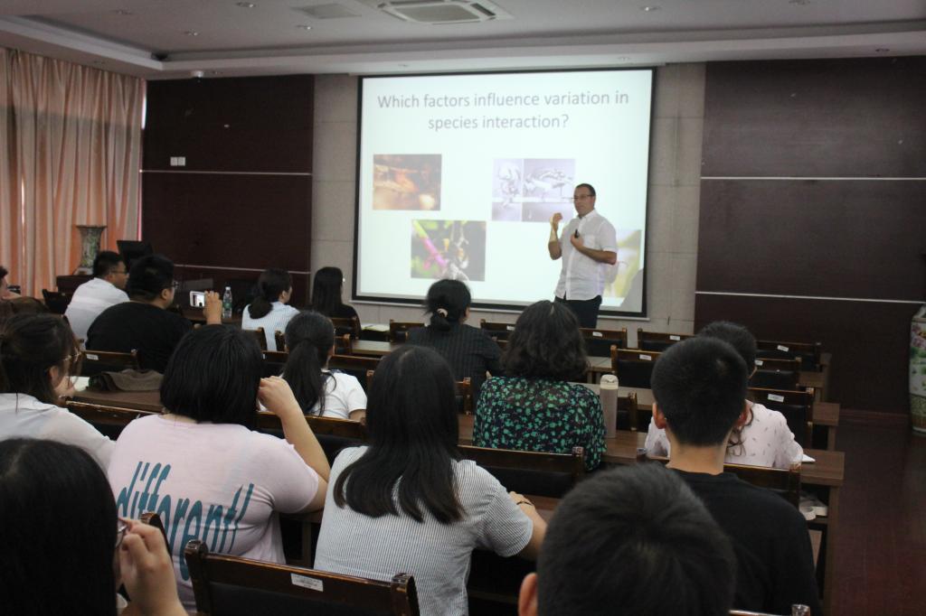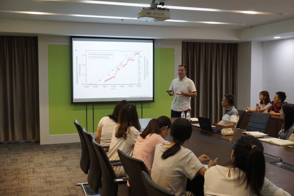 报告中,Rasmann博士分别从直接和间接作用两个方面介绍了植物对害虫的防御策略,对根系植食者诱导的挥发性物质进行了分析,并指出该种物质对害虫天敌昆虫病原线虫具有招募作用。他还讲解了土壤有益微生物(真菌和细菌等)如何帮助植物提高抗性以抵御植食害虫,介绍了该研究在农业可持续发展中的潜在应用。随后,Rasmann博士介绍了如何撰写文献综述,并分享其文献综述的写作方法与经验。另外,Rasmann博士还从微观到宏观尺度逐一分析了植物基因遗传差异、资源权衡分配、海拔梯度、群落互作等生态/进化因子对植物化学防御害虫的影响。报告期间,Rasmann博士逐一解答了在场师生的提问并进行了热烈讨论。此次学术交流活动取得了良好的研讨成果,对今后环境过程与污染控制国际联合实验室开展纳米技术促进农业可持续性发展、污染物的根际化学通讯等国际前沿研究起到了积极的作用。