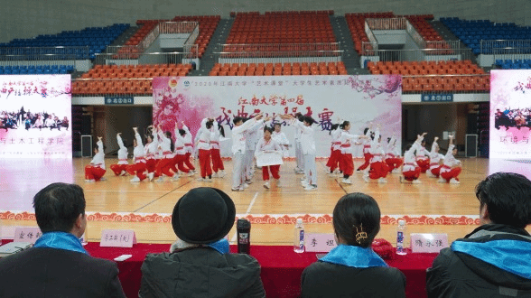 比赛开始,赛场上百花争艳,来自各院的队伍身着各色服饰陆续登场。我院参赛选手,迈着整齐的步伐,精神饱满地进入比赛场地。他们以自信的姿态和充满活力的舞姿展现出青春活力,一静一动尽显戏曲之魂,绕手踢腿独展环土魅力,赢得了在场观众的阵阵掌声。
