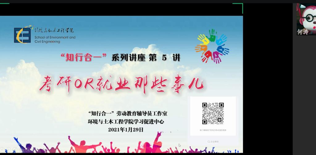 为提高2018级学生大学生涯规划意识,1月29日下午,在前期汇总每位同学考研与就业意向的基础上,伟德国际1946bv环境与土木工程学院利用线上平台召开2022届毕业生考研就业动员大会暨“知行合一”系列讲座第5讲——考研OR就业那些事儿,帮助同学们尽快明确未来规划。本次讲座由学院团委书记周佳赟主持,土木工程专业辅导员何涛主讲,2018级全体本科生参与。