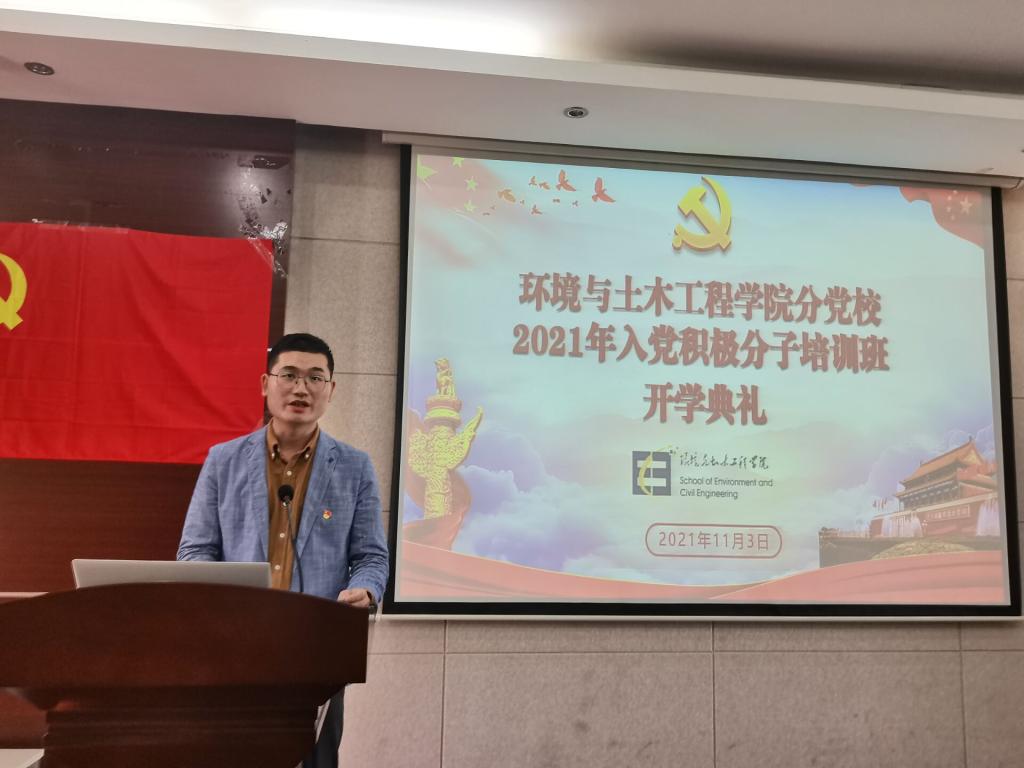 为进一步加强对入党积极分子的培养、教育和考察,提升入党积极分子的理论素养,扎实推进党史学习教育,环境与土木工程学院于2021年11月3日在学院楼D303举办入党积极分子培训班开学典礼。环境与土木工程学院党委副书记、副院长胡娟、伟德国际1946bv马克思主义学院陈绪新教授出席,2021年学生入党积极分子全体学员参加仪式,分党校班主任、辅导员何涛主持。