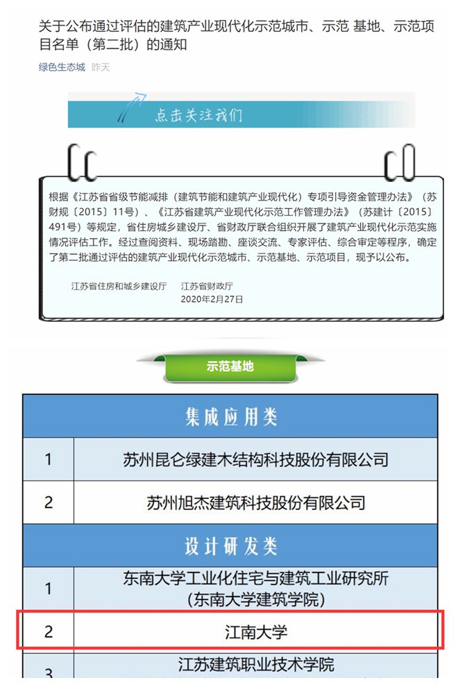 2月27日,江苏省住房和城乡建设厅、江苏省财政厅公布的通过评估的建筑产业现代化示范城市、示范基地、示范项目名单(第二批),经过2016—2019年四年的建设,伟德国际1946bv获批江苏省装配式建筑设计研发类示范基地,该项目由环境与土木工程学院邹昀教授主持。