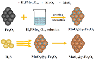 为此,我院环境催化课题组通过磷钼酸嫁接对硫化磁赤铁矿进行改性:一方面通过调控磷钼酸与磁赤铁矿的界面效应抑制磁赤铁矿相变而提高其热稳定性,进而提高其磁性;另一方面通过控制磷钼酸嫁接磁赤铁矿表面的硫化效应而提高其表面活性硫物种的含量,进而提高其零价汞吸附能力。开发出了能协同湿式电除尘器回收燃煤烟气中零价汞的高效并可循环使用的MoSx@γ-Fe2O3磁性吸附剂,为推动我国燃煤电厂汞污染控制从形态调控向集中控制的转型升级提供了重要技术支撑。