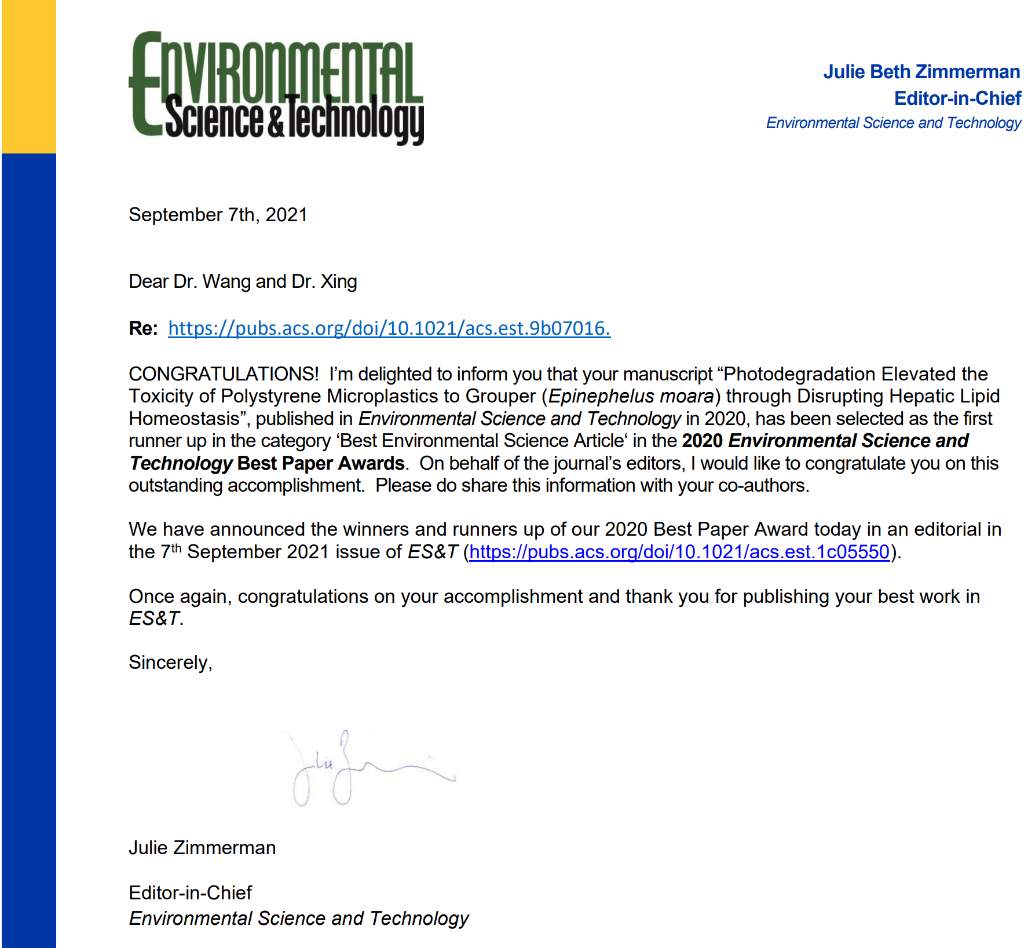 近日,环境领域国际顶级期刊 Environmental Science and Technology(ES&T) 公布了该期刊2020年度的13篇“最佳论文”(ES&T's Best Papers of 2020)名单。由中国海洋大学博士后王潇、郑浩副教授为共同第一作者,伟德国际1946bv环境与土木工程学院王震宇教授和美国麻省大学安姆斯特分校Baoshan Xing(邢宝山)教授为共同通讯作者,于2020年3月24日在ES&T发表的封面论文“Photodegradation Elevated the Toxicity of Polystyrene Microplastics to Grouper (Epinephelus moara) through Disrupting Hepatic Lipid Homeostasis”,荣获2020年度最佳论文奖(环境科学类第2名,共4项)。研究团队聚焦于全球高度关注的微塑料污染的热点生态环境问题,揭示了聚苯乙微塑料光降解的途径和机制,定量评估了光降解产物纳米塑料颗粒和内源化学污染物的产率;从生理代谢、细胞毒性和基因调控方面阐明了光降解的聚苯乙烯微塑料对海洋生物云纹石斑鱼的肝脏毒性机制。该研究首次揭示了微塑料光降解行为对其生物毒性效应的调控机制,加深了对环境自然老化过程中微塑料的环境行为和生态风险影响的科学认识,为微塑料的生态风险评估提供了重要的理论依据。