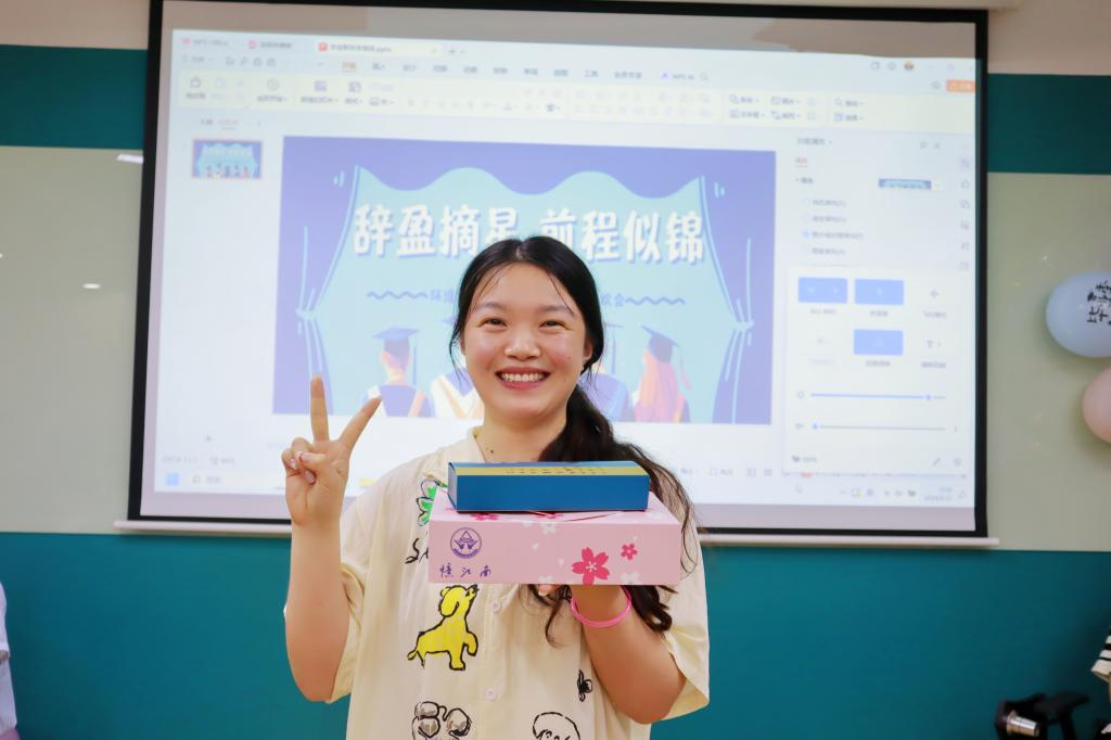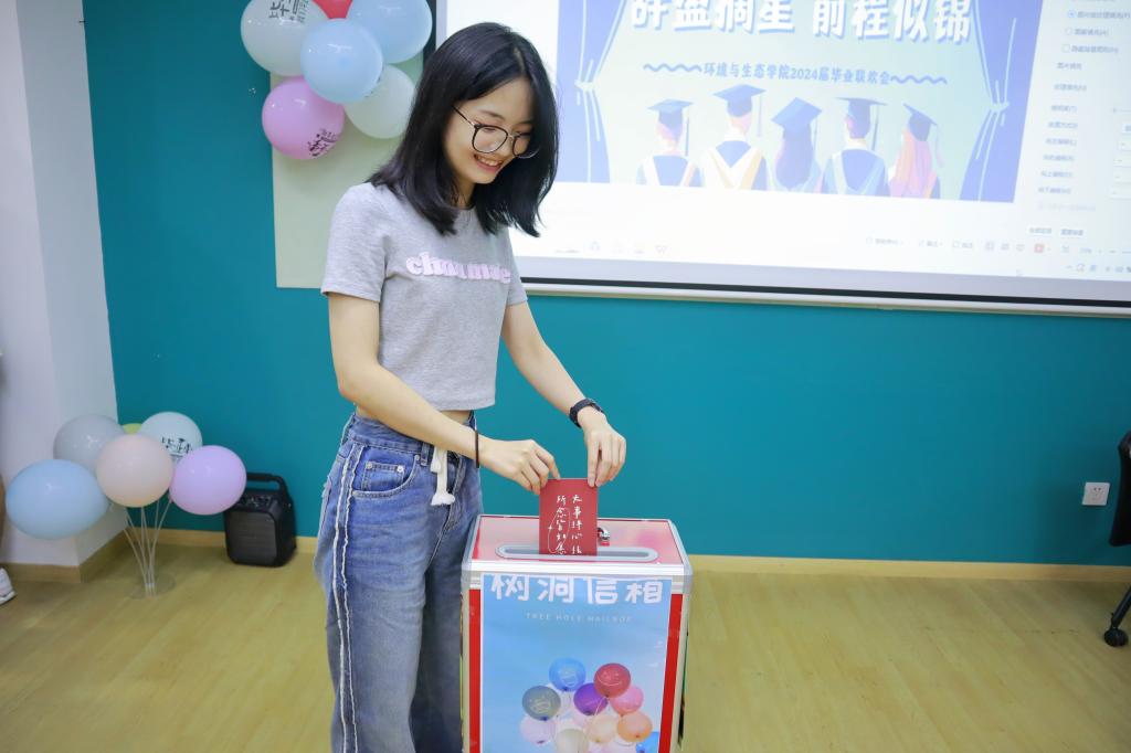 联欢会在“环境树洞——我想对你说”活动中拉开序幕,毕业生在明信片上写下对未来的期望、对过去的怀念、对老师的感谢、对同学的不舍和对学院发展的建言献策。王震宇寄语全体毕业生要保持对生活的热爱和对知识的渴望,坚持终身学习,不断探索和创新,时刻不忘自己“江南环境人”的身份,为美丽中国建设提供江南智慧。随后,李艳和王震宇为毕业生分发了象征甜蜜与成功的毕业蛋糕,不仅增添了联欢会的喜庆气氛,也饱含着对毕业生们未来生活的美好祝愿。在场的老师们也分别对毕业生进行了寄语,向毕业生们表达了最真挚的祝福。