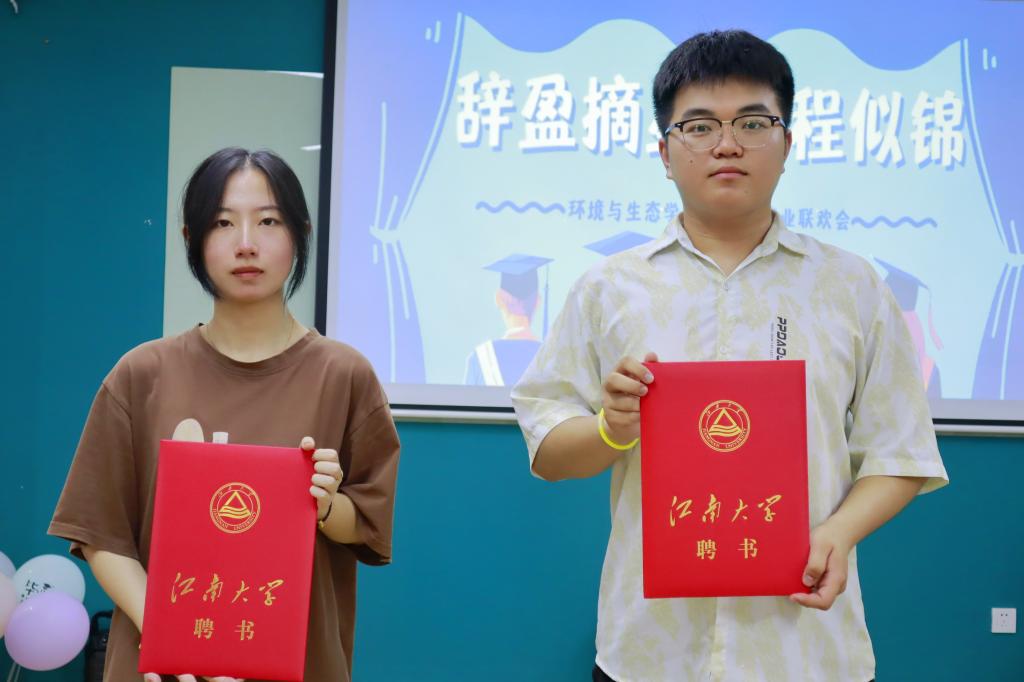 联欢会上开展了包括“你划我猜”、“动作接龙”在内的一系列游戏互动环节,毕业生们积极参与,现场气氛热烈,笑声和欢呼声此起彼伏。形式独特的抽奖环节更是将联欢会推向了高潮,座位下的“惊喜”、抢红包“手气王”,丰富多样的奖品寄托着学院对毕业生们的美好祝愿。活动最后,进行了校友联络人聘用仪式,选聘毕业班班长白雪佳、成厚儒为2024届环境学院校友联络理事,以期在未来能够更好地团结“天下江南人”。