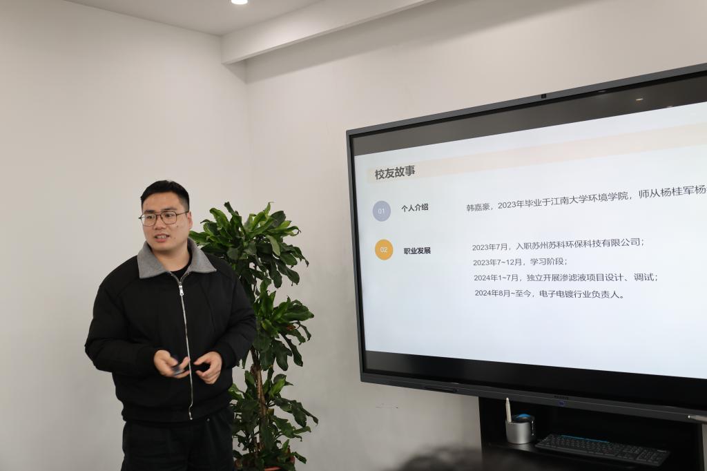 座谈会上,赵艳详细介绍了企业的发展历程、核心业务以及未来规划,并系统阐述了苏科关于“未来菁英计划”人才培养体系,强调企业构建的"技术研发+项目管理"双通道职业发展模式。赵龙博士向在场师生深度解析了“威乐普”膜技术的迭代研发历程与市场应用前景。2023届校友韩嘉豪、胡新宇以技术工程师身份分享了他们从校园到职场的转变过程中,凭借扎实的专业知识和不懈的努力,迅速在技术领域崭露头角。他们的故事不仅激励了在场的学弟学妹们,也为即将步入职场的同学们提供了宝贵的经验和建议。