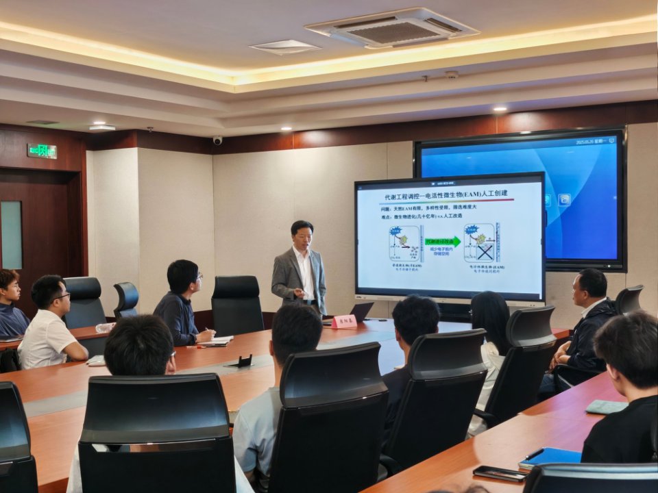 讲座中,雍阳春教授深入浅出,针对细胞跨膜电子效率低与电极表面天然生物膜生物量负载较低的瓶颈问题,介绍了团队在希瓦氏菌调控生物膜形成与种间电子传递过程中的最新科学进展。采用聚苯胺涂层的三维石墨烯作为阳极,解决了传统微生物燃料电池细菌负载量与跨膜电子传递效率低的问题,显著提升了功率输出。在此基础上,结合希瓦氏菌原位还原石墨烯过程,形成了三维大孔导电生物膜,阳极氧化与阴极还原电流密度得到显著提升。从多细胞生物膜控制到杂合单细胞工程,阐述了希瓦氏菌在生物膜形成与种间电子传递过程中的重要作用。重点介绍了“单细胞电子收集器”在电子跨膜运输过程中的优势,相较于传统电极,该设计通过全表面覆盖的结构,降低了接触距离,达到了纳米级紧密接触,并形成了多重传导通路,丰富了电子传导路径。针对如今污染物资源化再利用的新趋势,从细胞跨膜电子传递角度出发,为未来进一步优化微生物燃料电池性能提供了新的可能性。