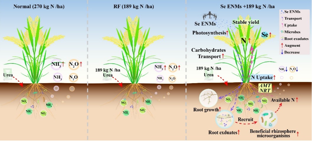 该研究通过田间实验,从光合作用启动开始,逐级追踪叶-根-微生物-氮的连锁反应,系统评估了纳米硒(Se ENMs)在减氮条件下的环境和经济效应。研究发现,与减氮处理相比,减氮并施加Se ENMs可显著提高植株的净光合速率和叶片碳水化合物含量;碳水化合物转运关键基因表达量的上调,驱动了根系生长并富集有益微生物;土壤氮转化功能基因发生显著改变,硝化作用关键基因上调,反硝化相关基因受到抑制;水稻根系氮转运蛋白基因表达上调,氮肥利用效率显著提高。最终,在减氮30%的前提下,实现了稳产提质,环境负面影响减少41.0%,经济效益提升38.2%的显著效应,为现代农业“减肥降碳”提供了新策略。