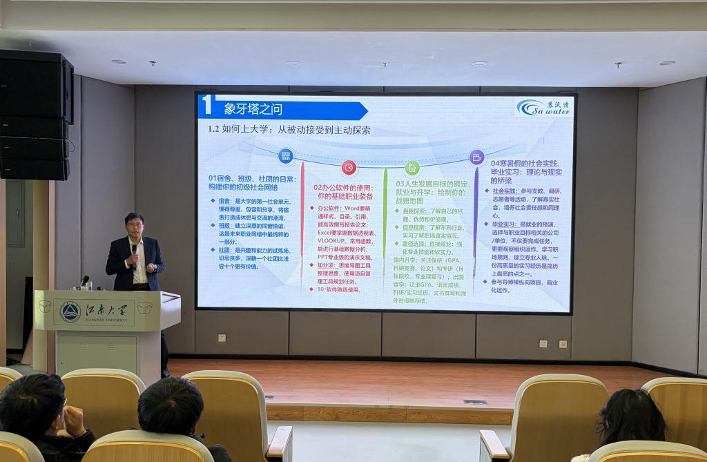 在专题讲座中,徐富博士结合自身成长经历,为师生们展现了一名专业环境人的成长经验与行业担当。首先,他以“科研、学术与事业的协同发展”为主题,深入探讨了高水平研究成果的产出机制,详细阐释了论文发表、专著撰写及科技奖项申报的策略与方法,强调了产学研深度融合对科技创新的推动作用。同时,他就科研工作者如何实现工作、家庭与事业的平衡提出了独到见解。