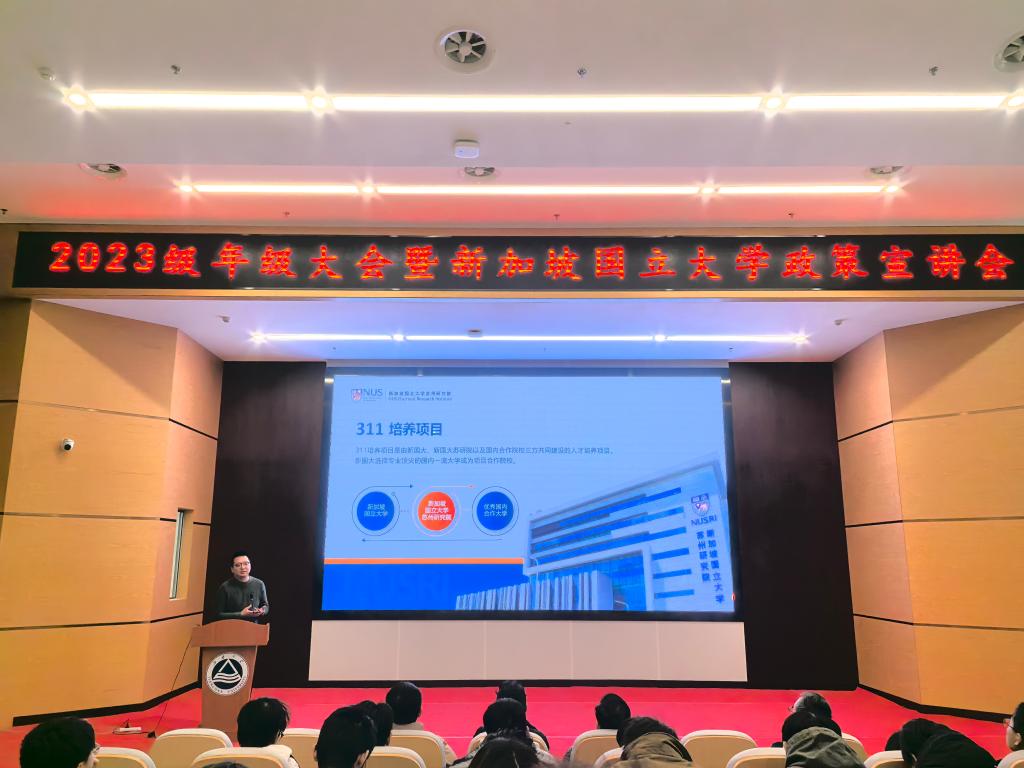 12月23日下午,伟德国际victor·1946源自新加坡国立大学“3+1+1”项目宣讲会暨2023级年级大会在东氿校区钱盘生楼A101报告厅顺利召开。新加坡工程院院士、新加坡国立大学荣誉教授王世龙,新加坡国立大学环境工程系主任胡江泳,新加坡国立大学苏州研究院徐栋、杨轩,学院辅导员李猛及2023级全体本科生齐聚现场,会议由学院副院长王新华主持。