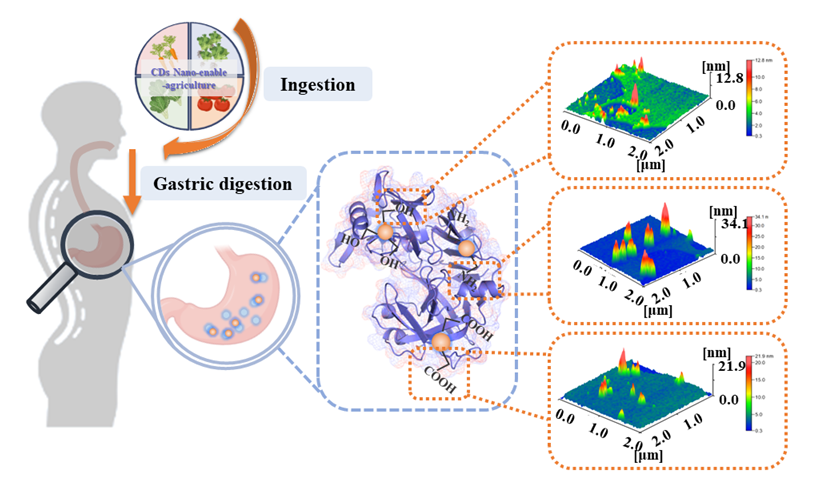 碳点的不同官能团影响蛋白冠的形成和胃蛋白酶的体外消化特性示意图
